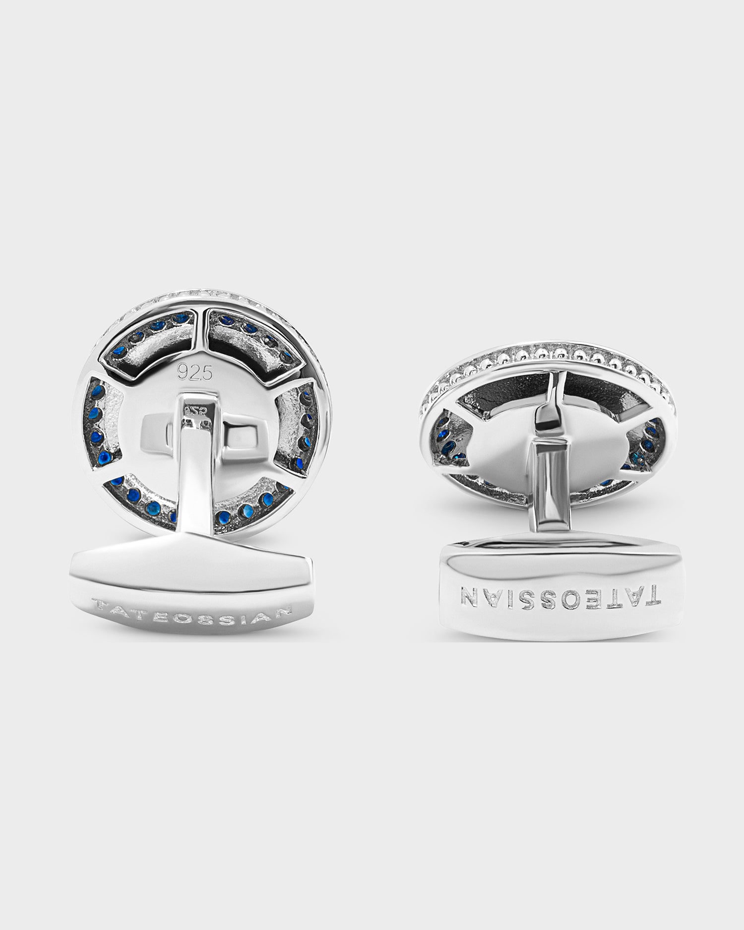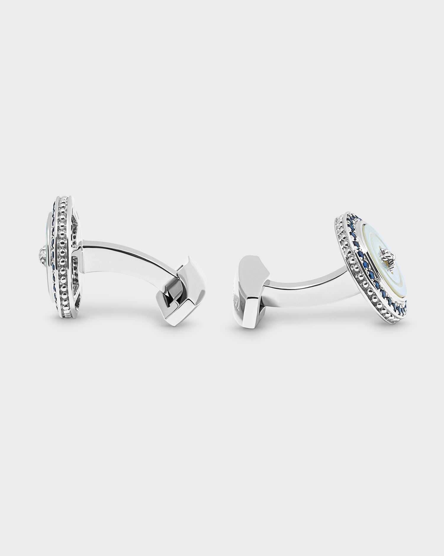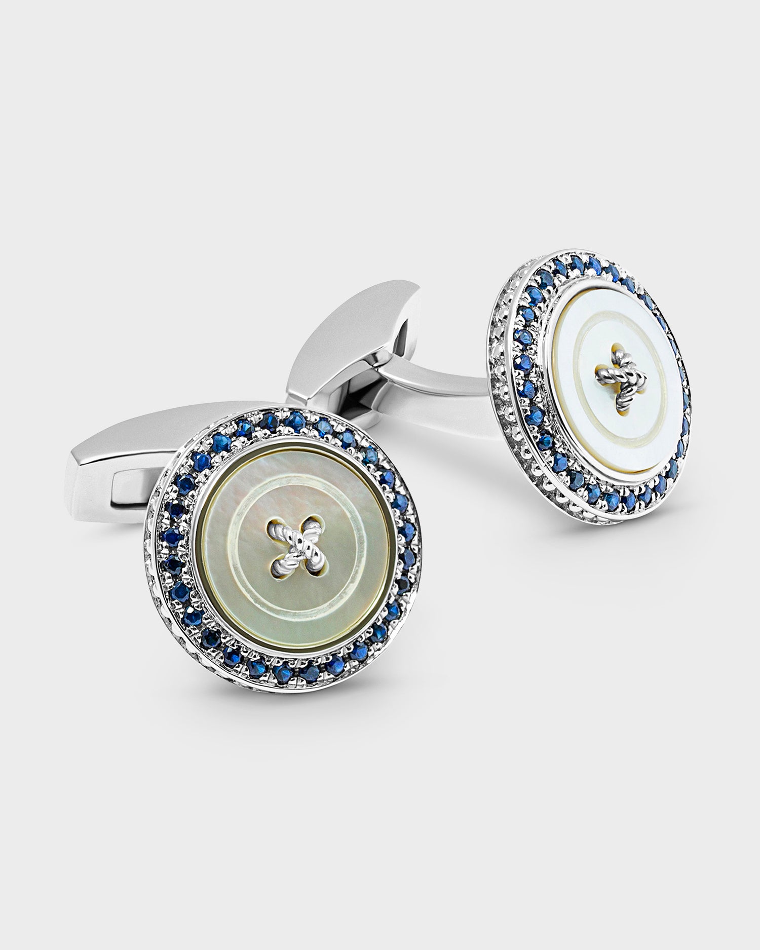 A luxurious reinvention of the classic tailoring button. This button is meticulously crafted from three materials, silver, semi-precious stone and precious sapphires. The semi-precious stone follows shape of a button and even has a grooved channel line carved into it; the centre has a raised silver wire just like that of a button. The outer frame of the cufflink has skilfully set sapphires.