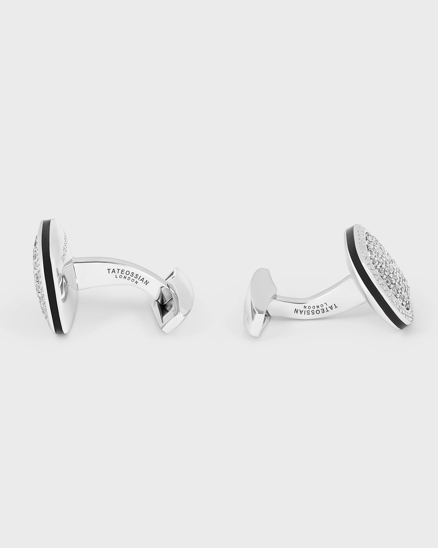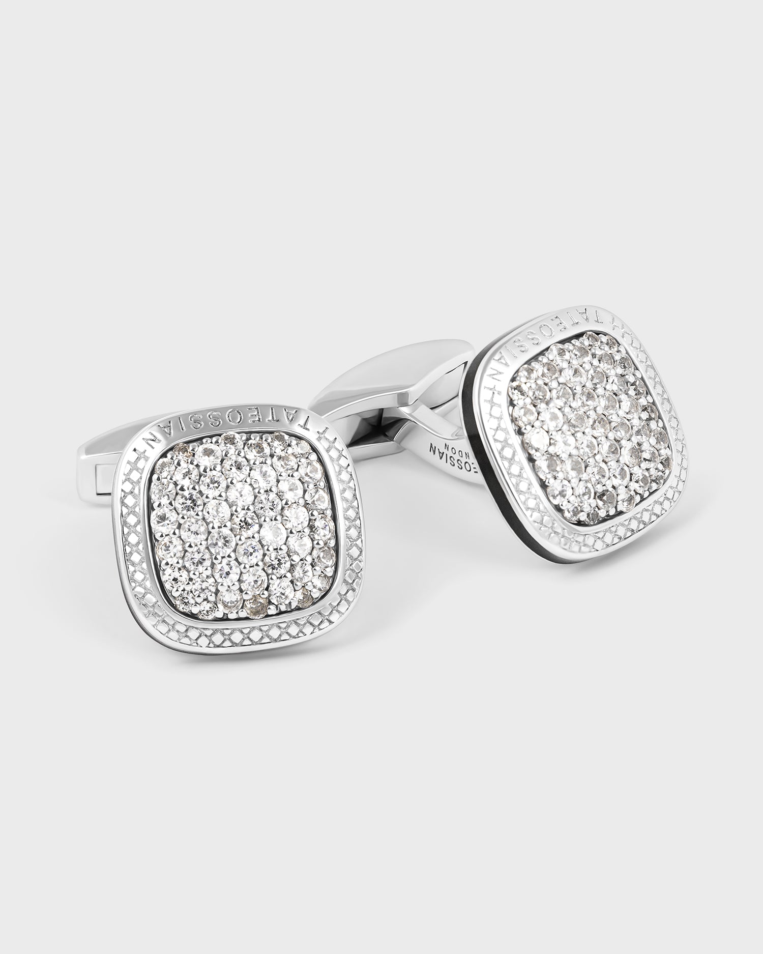 Discover the Diamond Signature Cufflinks in Rhodium & White Sapphire. Introducing Tateossian's classic rounded square cufflinks, featuring a central square design with white sapphire pave stones, encircled by our signature diamond pattern. Crafted from brushed rhodium-plated sterling silver, these cufflinks are accented with a hand-painted enamel line on the edge. Elegant and refined, they are the perfect accessory for any sophisticated ensemble.