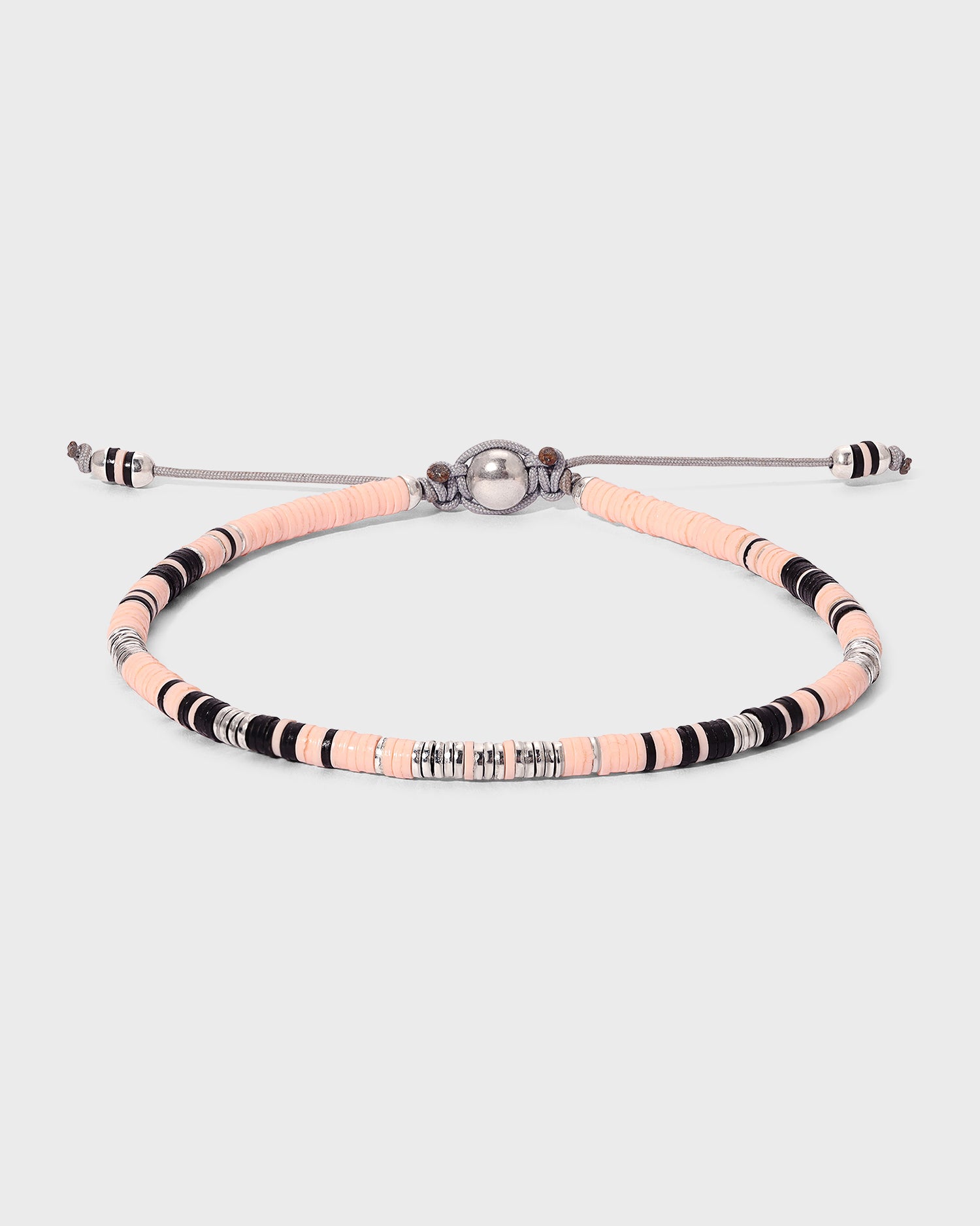 The MAOR Mini Rizon Bracelet in light pink is a foundation piece for your arm stack that provides a little pop of colour. Made from 925 sterling silver discs and African trade beads into a vibrant pattern designed to be layered with your other MAOR wrist pieces.