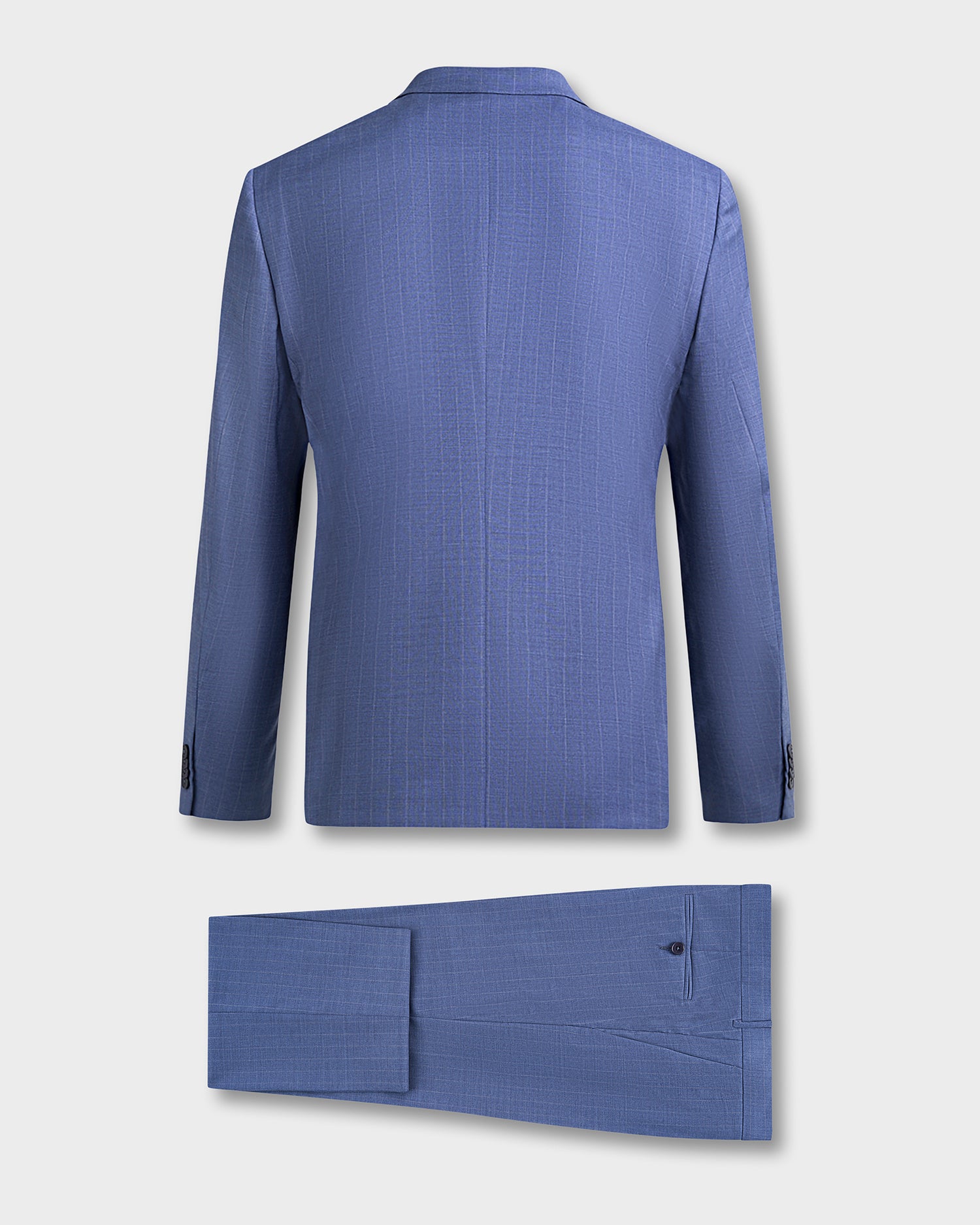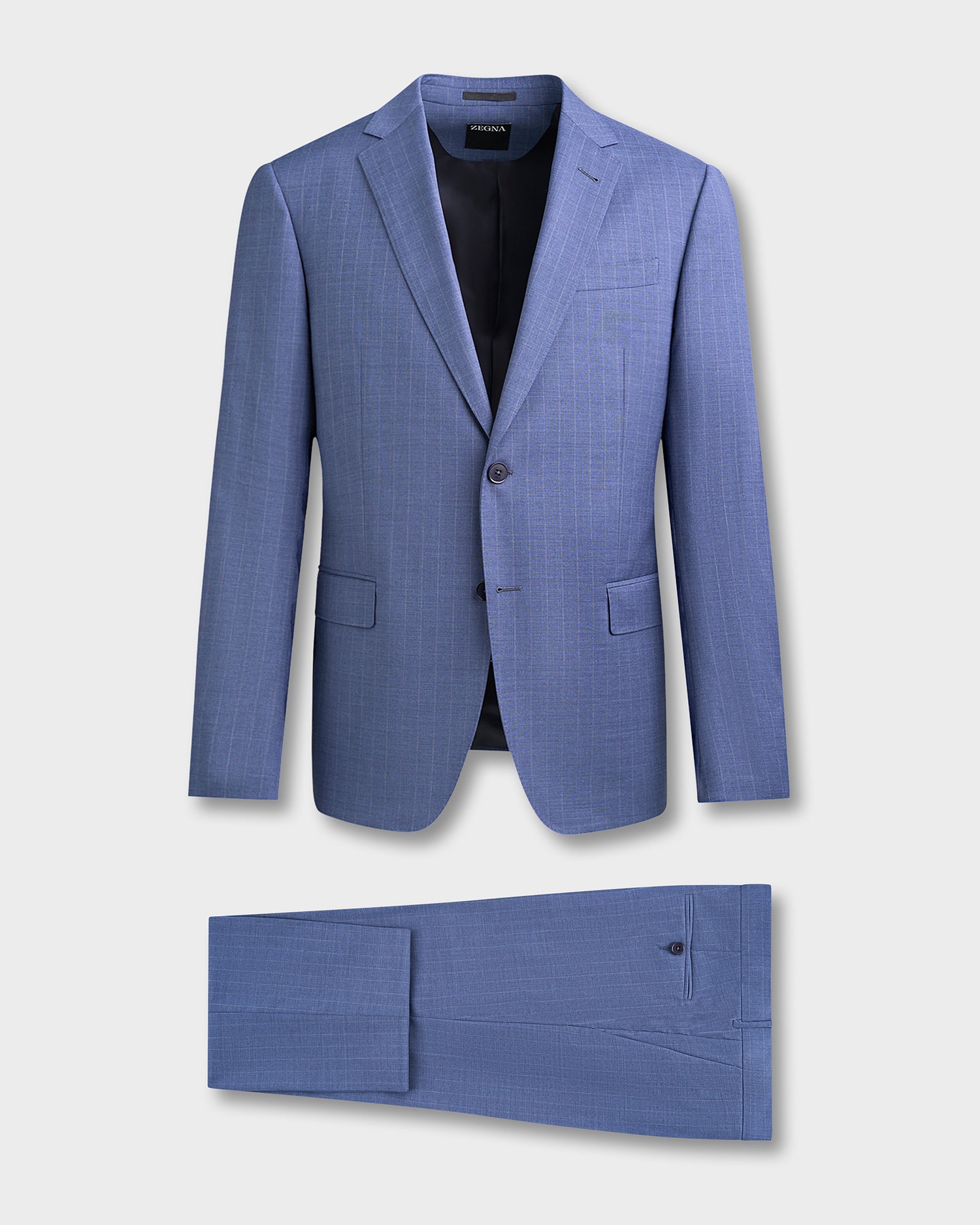 Impeccably tailored in Italy, this blue suit with refined grey pinstripes exemplifies modern sophistication. Cut to a slim, drop 8 silhouette, it sculpts a sharp, contemporary profile while maintaining ease of movement thanks to its fine wool with a touch of elastane. Classic details—flap pockets, notch lapels, and double vents—lend timeless appeal, making it a versatile choice for both business and formal occasions.