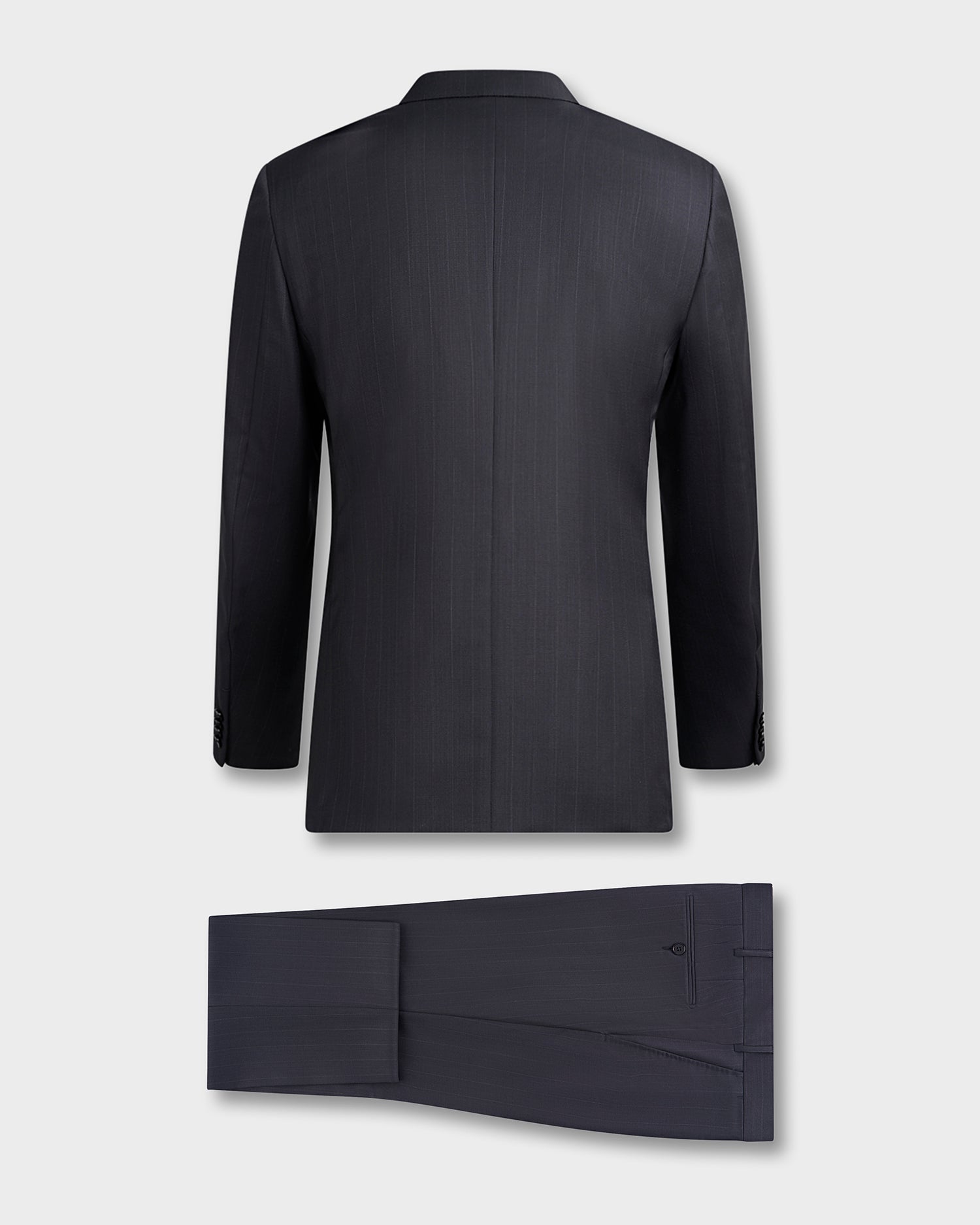 Silky smooth with featherlight comfort: meticulously selected ultra-fine wool fibers and silk provide this 15milmil15 suit with the perfect backdrop for a timeless very deep charcoal and fine pinstriped pattern.