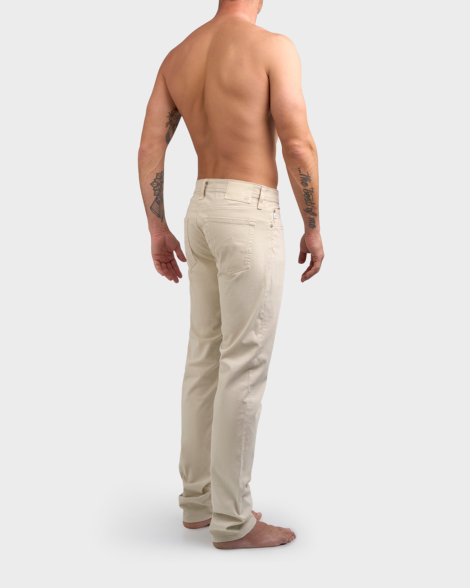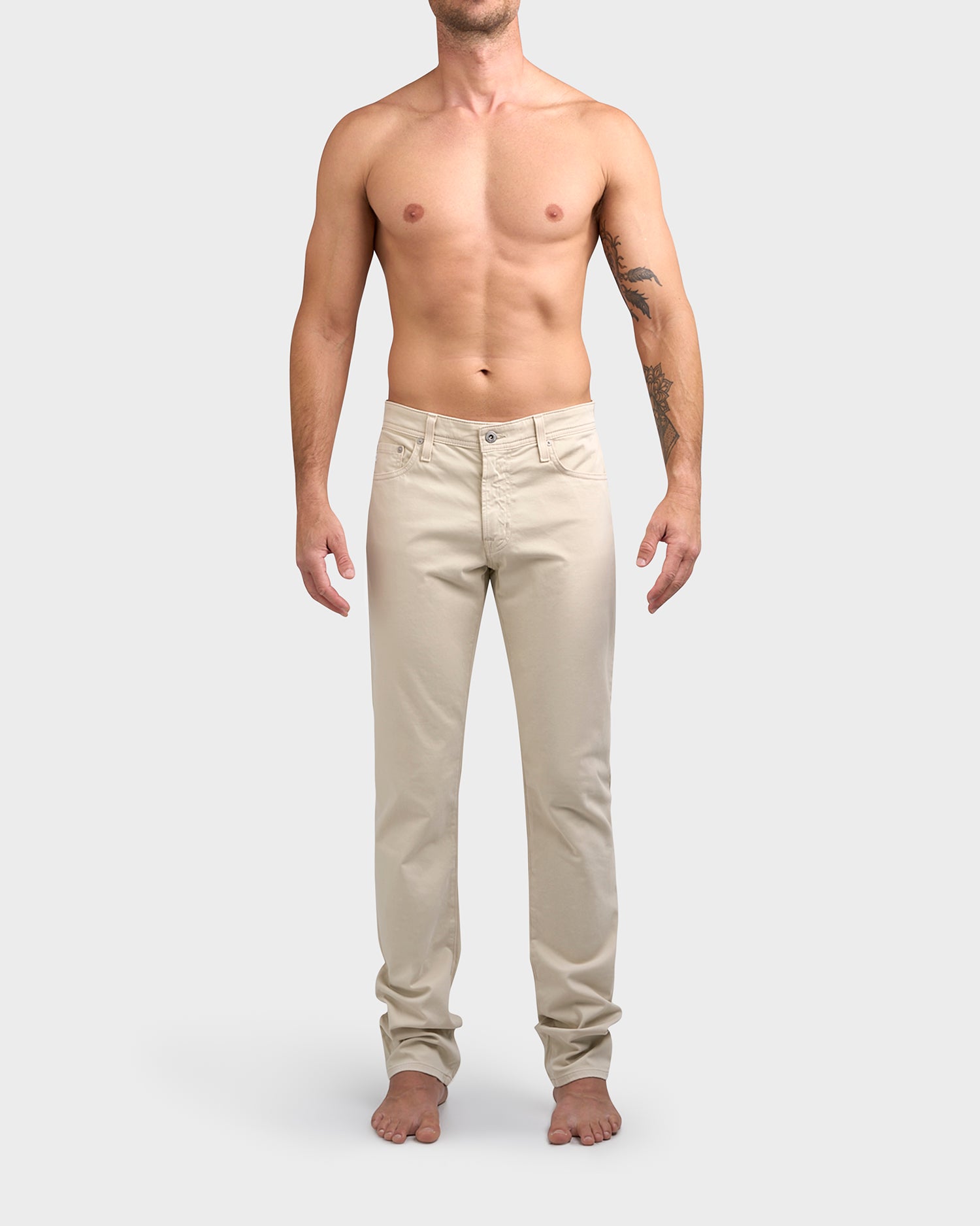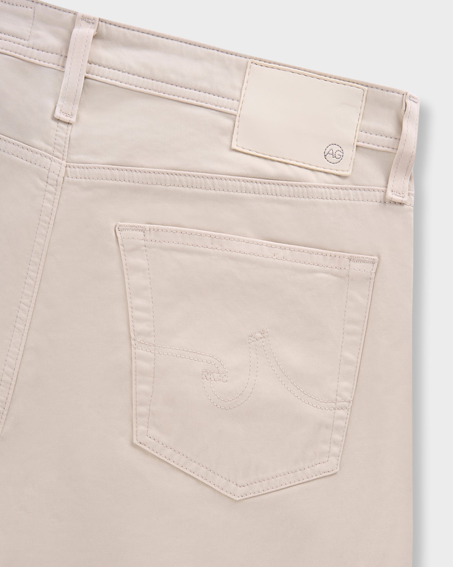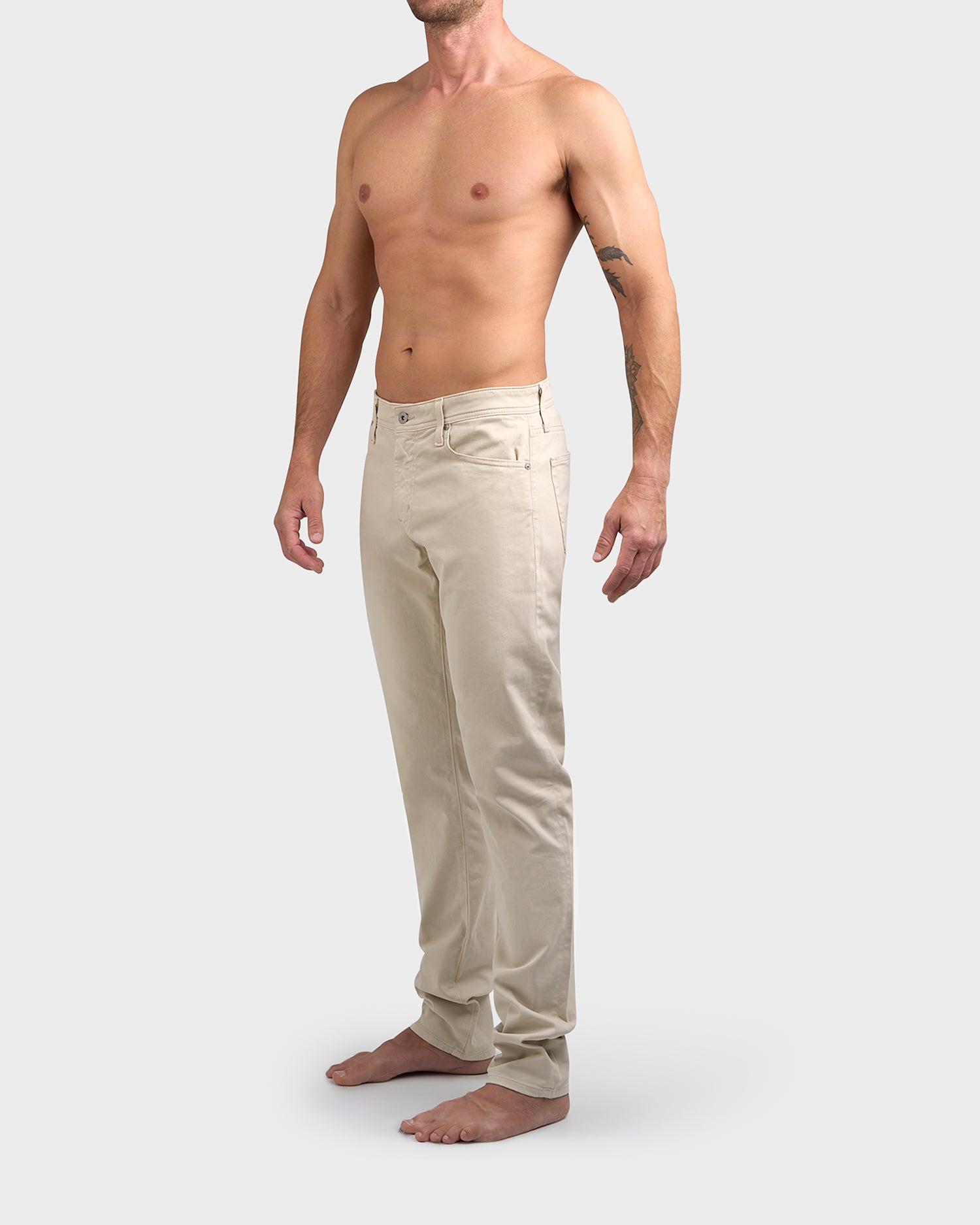 The Tellis is a modern slim pant with a mid-rise waist and a tapered leg. Made from 8.4 oz. Sueded Stretch Sateen, this five-pocket style offers a soft feel and comfortable wear. It comes in a Natural Ivory shade—a versatile khaki tone that works year-round.