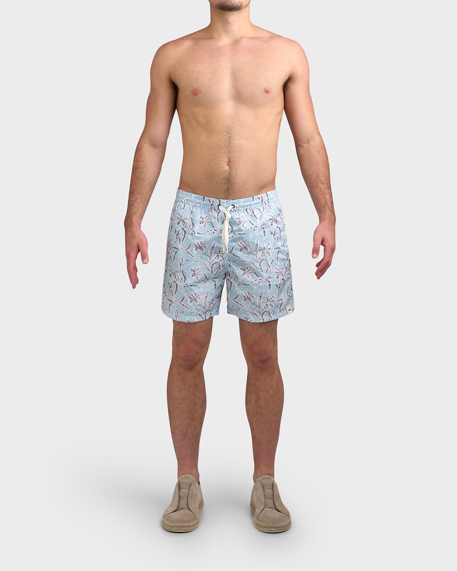 Light Blue with Cream and Navy Floral Pattern Swim Shorts