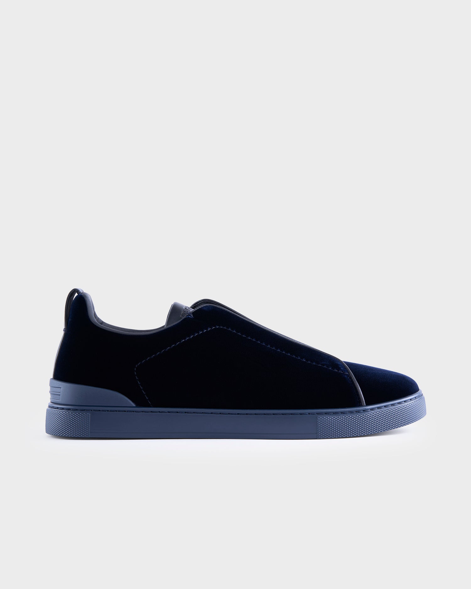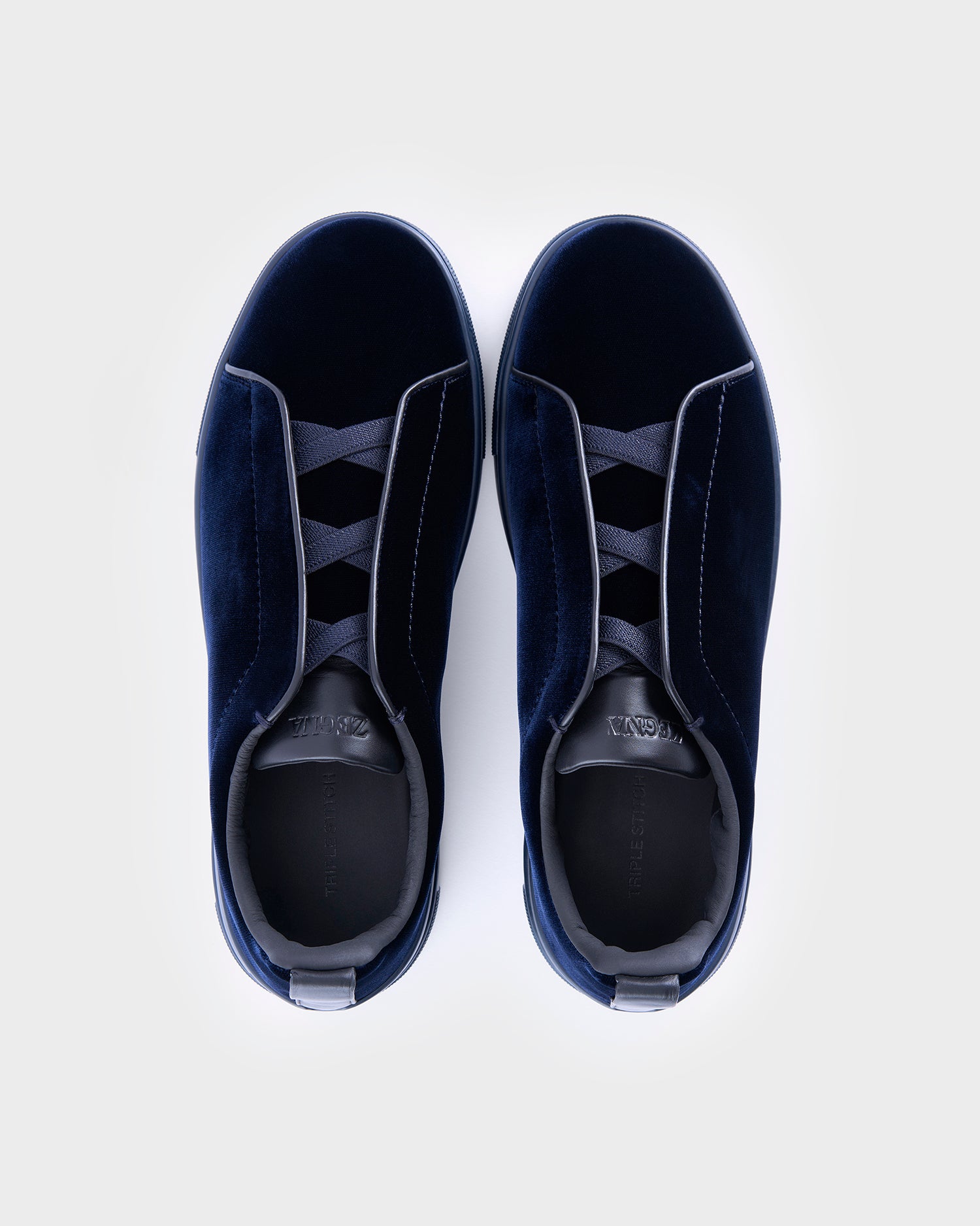 The Midnight blue Oasi velvet Triple Stitch™ low top sneakers blur the lines between elegant shoes and casual footwear. They slip on easily thanks to the triple-crossed elastics, a nod to the hand-stitching on our tailored jackets. The durable rubber sole provides support and resilience to complement the effortless design.