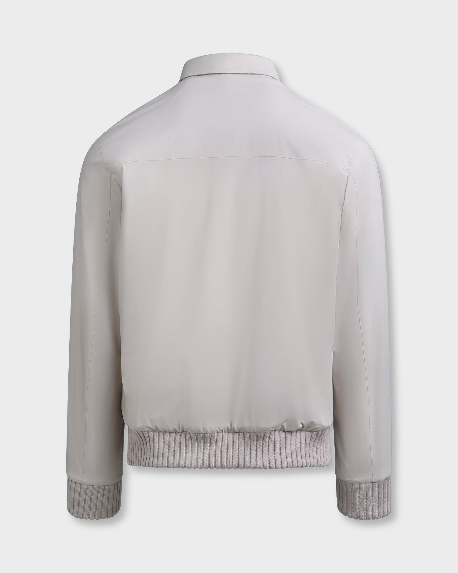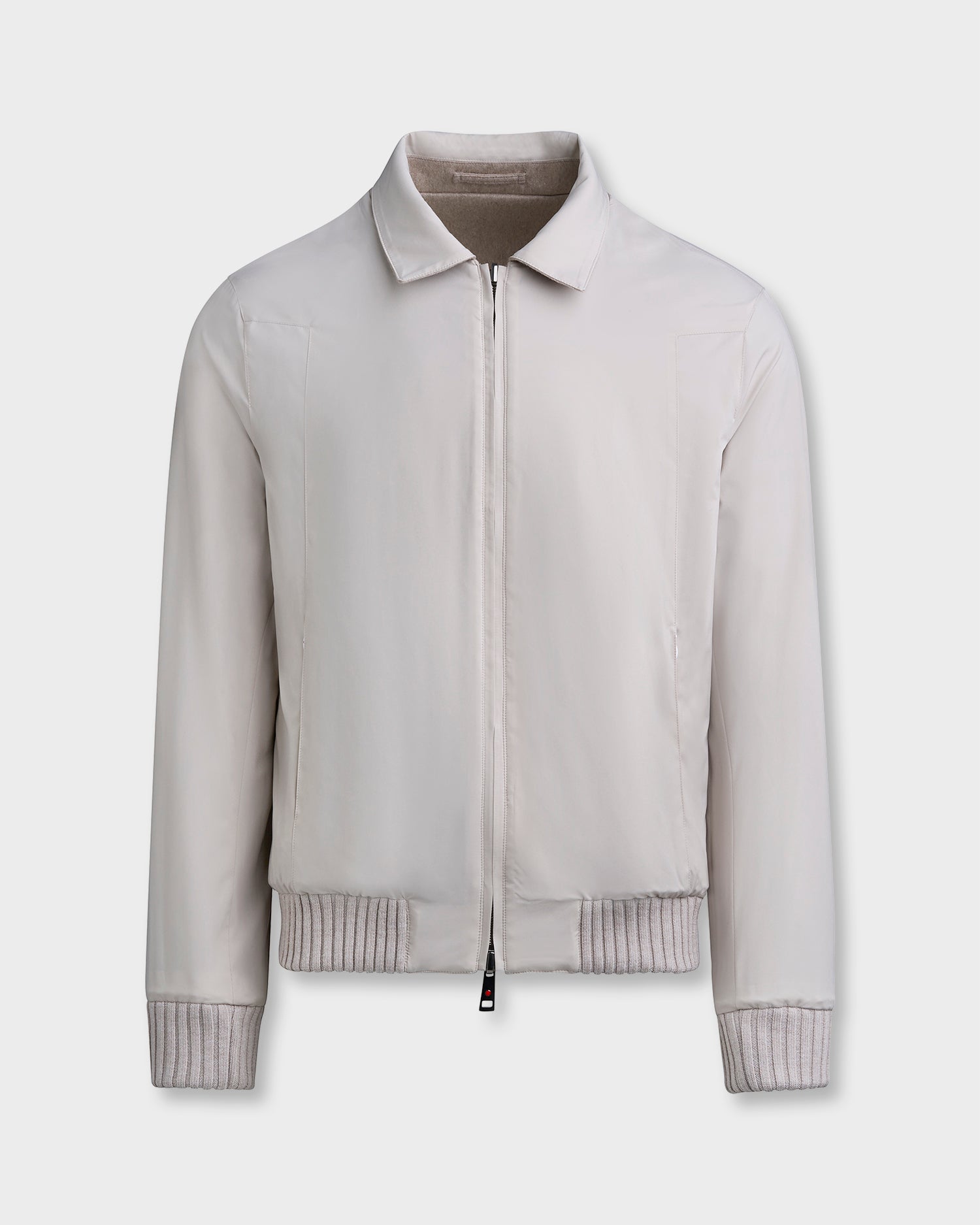 Introducing this refined cashmere bomber jacket by outerwear specialist Kired. Crafted from advanced technical fabric designed to withstand cool weather, this jacket is equipped with two side pockets and a double zipper. Notably, it offers versatility with its reversible design, flipping to an elegant grey shade with two side pockets with button closures. Enhanced with ribbed cuffs, and hem, it merges style with functionality seamlessly.