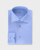 This blue microtextured pure cotton stripe shirt is meticulously constructed so every cut of fabric aligns in perfect harmony, creating a flawless, uniform design. The seams are hand-sewn to an exceptional softness, almost imperceptible to the touch. Hand-carved buttons in Sydney Pinctada Maxima mother-of-pearl are sourced from oysters cultivated off the Australian coast.