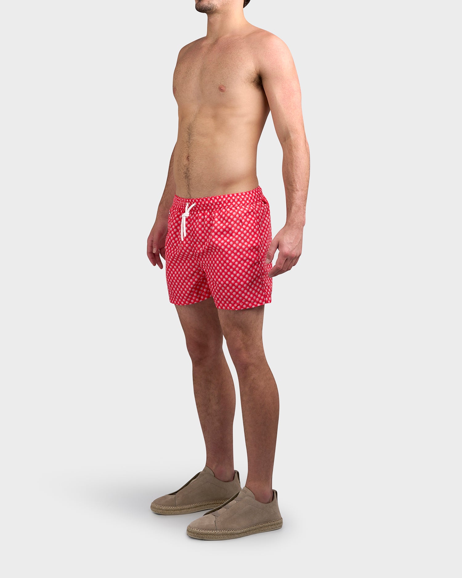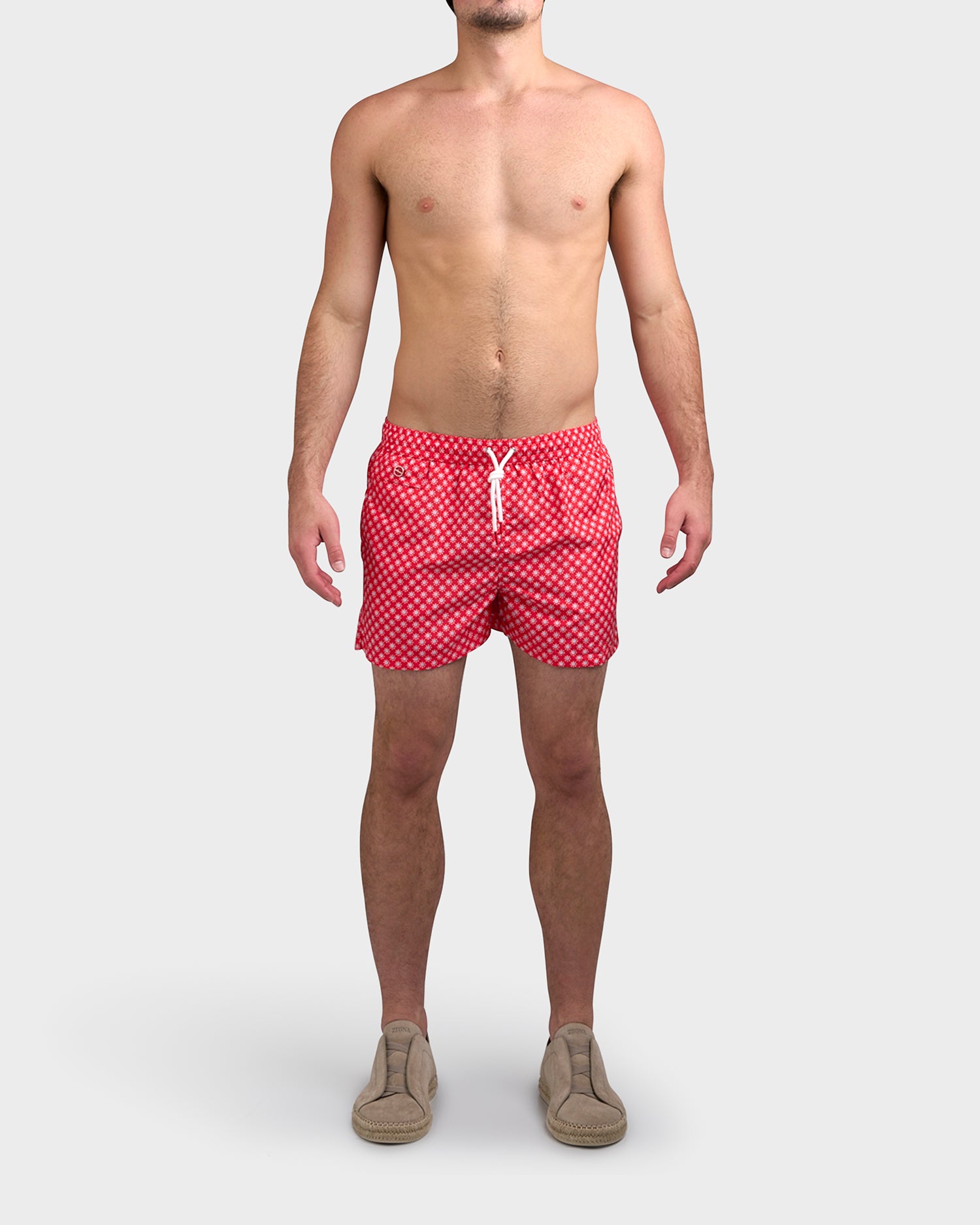 Short swim trunks in a bright red with powder blue and white pattern. The costume has an elastic waistband with logo-ed aglets, a side pocket with a logo-ed press stud made from zamak and coated in red lacquer, and a back pocket with a velcro flap on which the Kiton logo is embroidered. The Kiton beach collection features iconic prints inspired by the small seaside villages of the islands nestled in the Gulf of Naples.