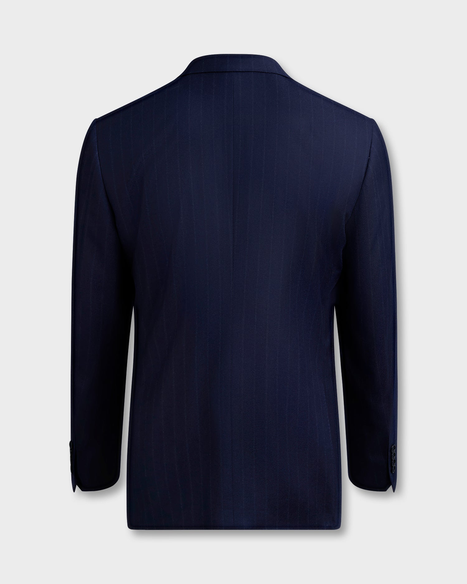 A dark blue chalk stripe suit by Canali, tailored in Italy from fine wool with a touch of elastane for natural stretch and comfort. The jacket is cut with a classic notch lapel, two-button fastening and flap pockets, offering a clean, structured silhouette. Double vents ensure ease of movement and a sharp drape, making it a refined choice for modern business and formal wear.