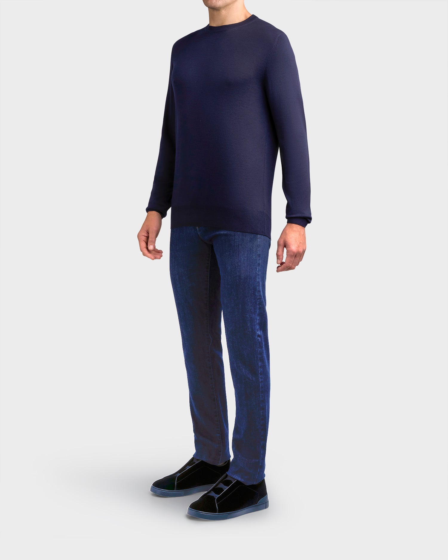 Cut in a versatile dark blue wash, these Italian-made jeans offer a refined take on everyday denim. Crafted from a lightweight blend of lyocell, cotton, modal and silk with a touch of stretch, they deliver exceptional softness with a fluid, comfortable fit. The  classic five-pocket construction keeps the silhouette timeless, while the elevated fabrication lends a more polished finish. Ideal for pairing with everything from relaxed shirting to soft tailoring, they balance ease with understated sophistication.
