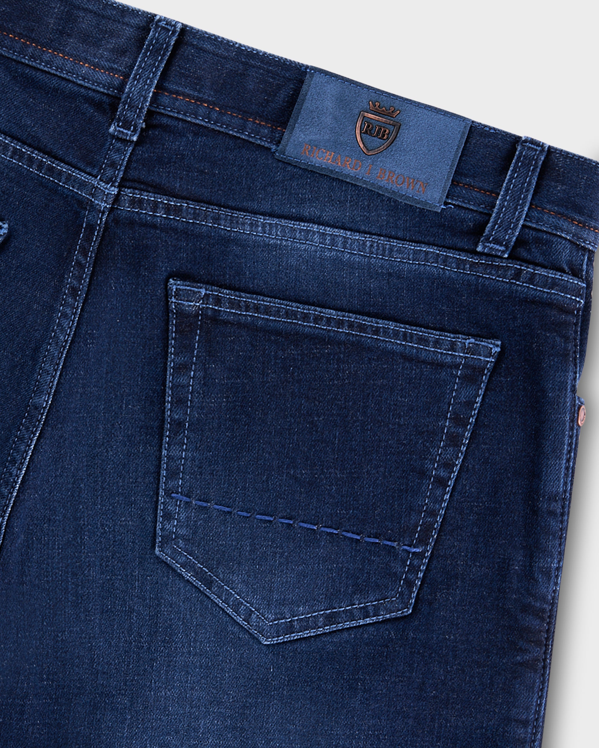 The hallmark of any RJB trouser is the hand stitching on the back pockets sewn by expert embroiderers with the finest yarns. The yarn used reflects the colours used for the rich and important patch, in several versions, from suede to nubby fabrics and enriched with an embossed or galvanized metal logo.
