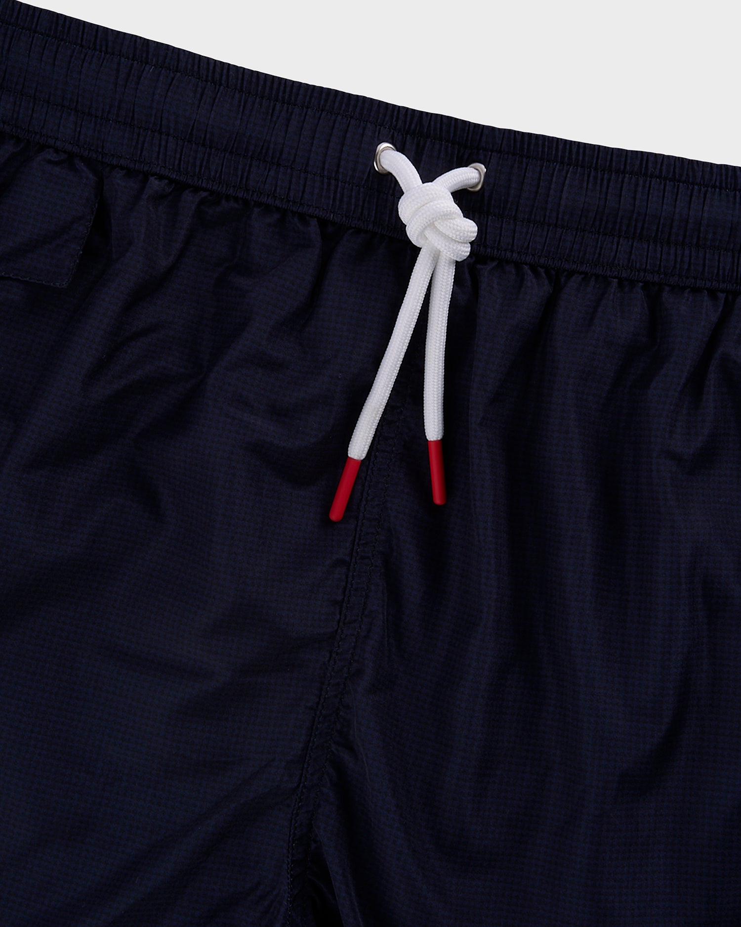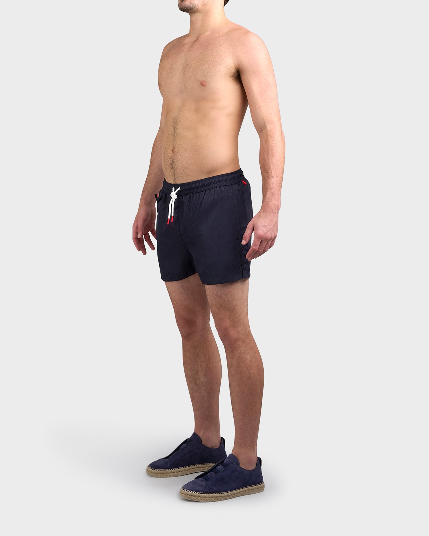 Short swim trunks in a solid dark blue shade. The costume has an elastic waistband with logo-ed aglets, a side pocket with a logo-ed press stud made from zamak and coated in red lacquer, and a back pocket with a velcro flap on which the Kiton logo is embroidered. The Kiton beach collection features iconic prints inspired by the small seaside villages of the islands nestled in the Gulf of Naples.