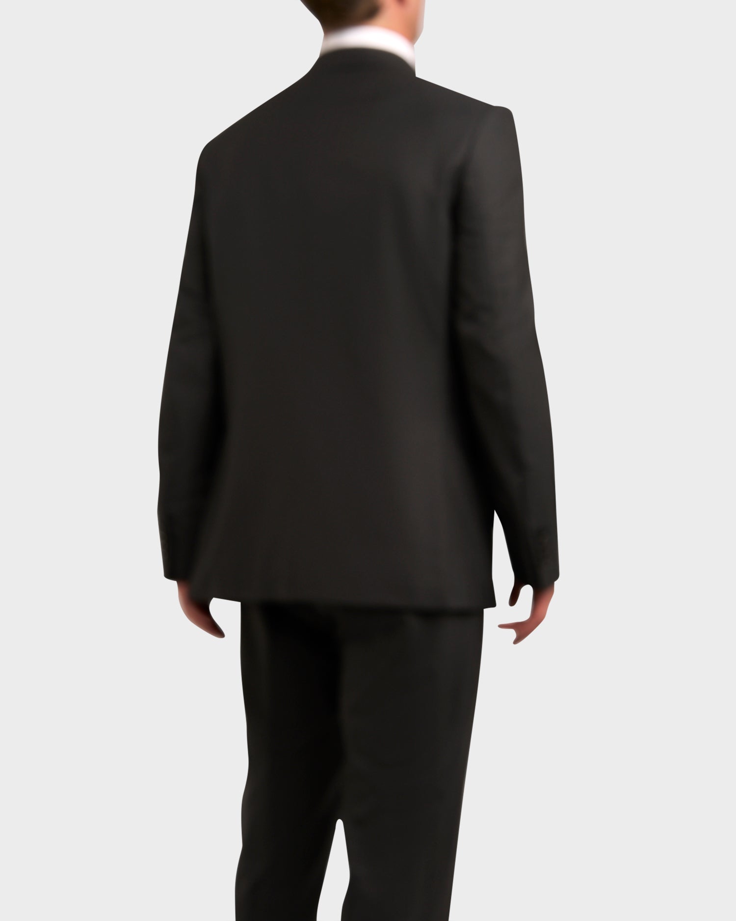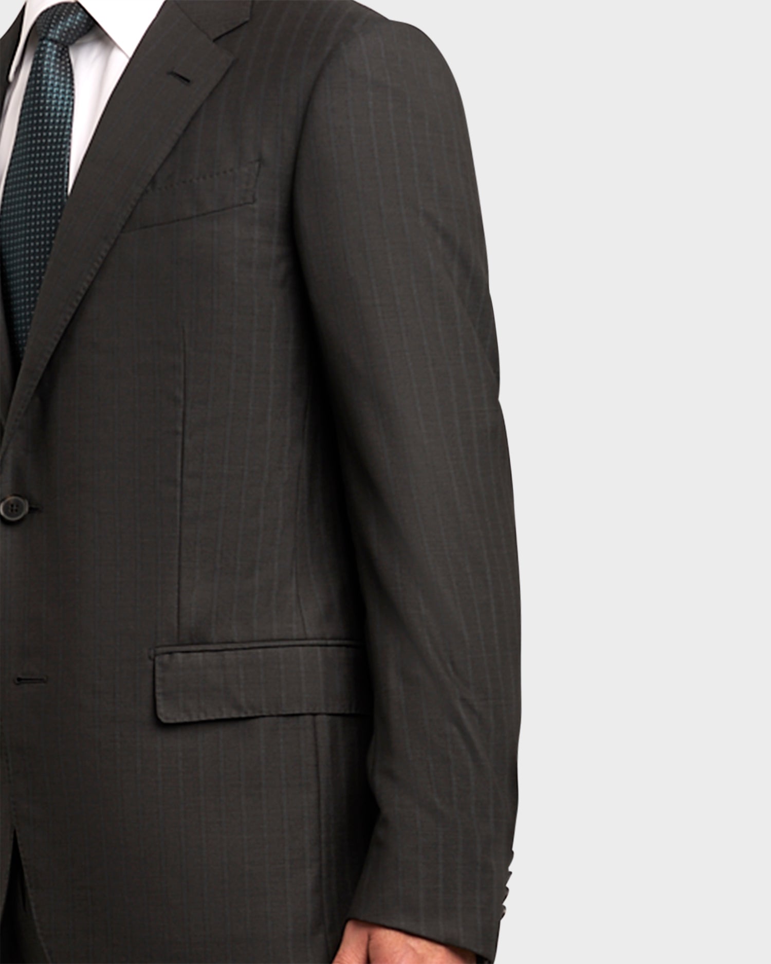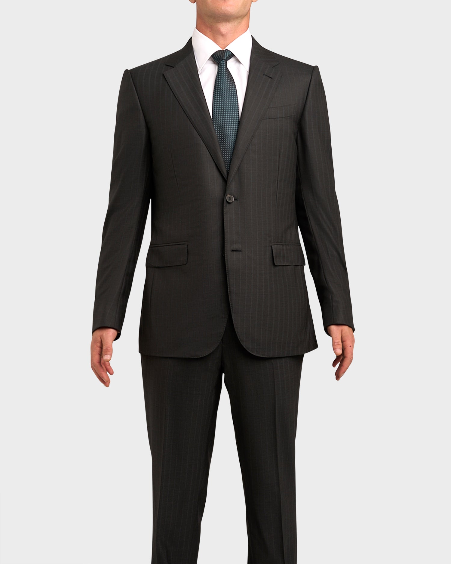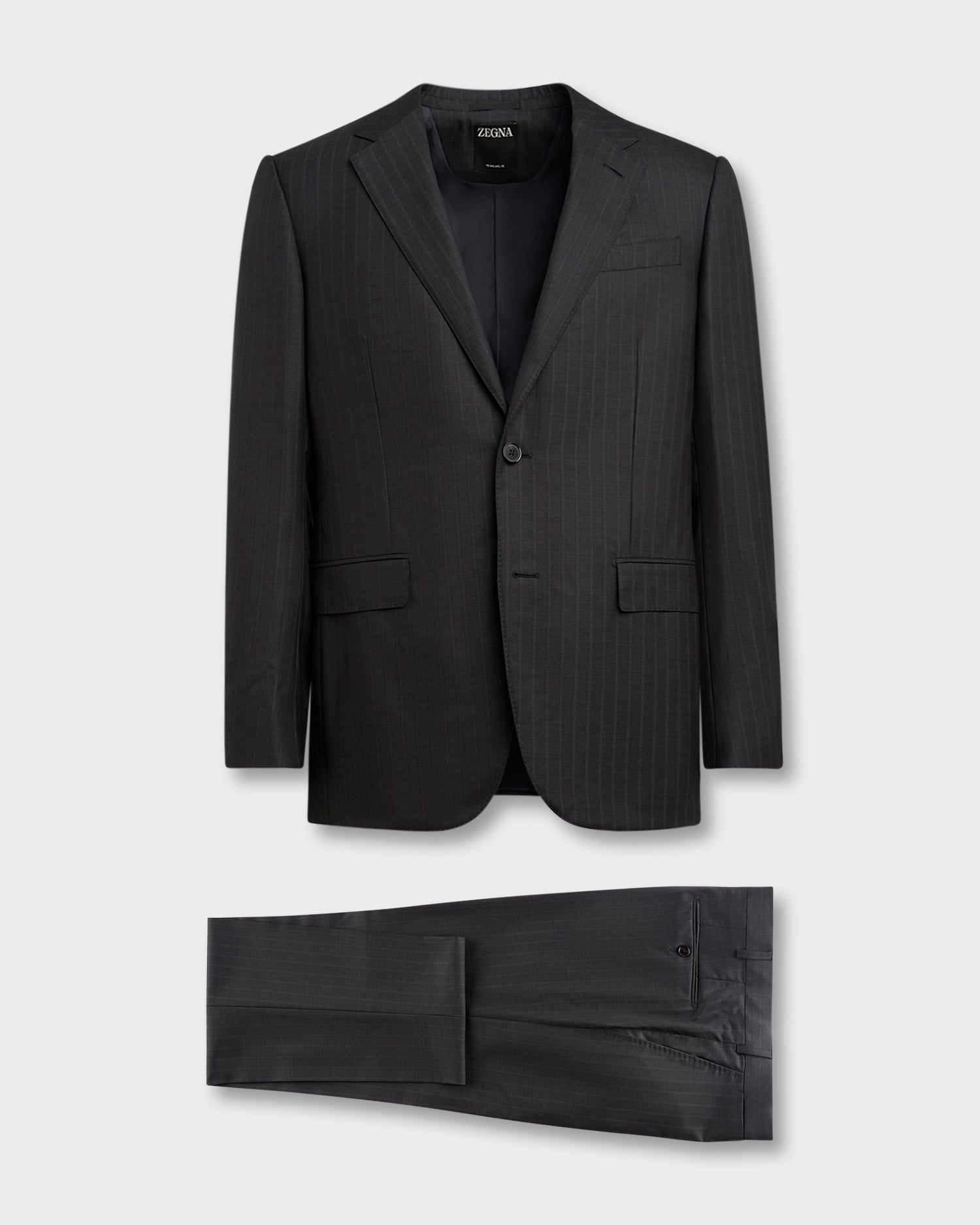 Crafted from specially selected, super-fine Australian wool fibers, the dark charcoal-15milmil15 wool tailoring suit is exceptionally soft and lightweight. A subtle pinstripe pattern adds a refined element to sophisticated wardrobes.