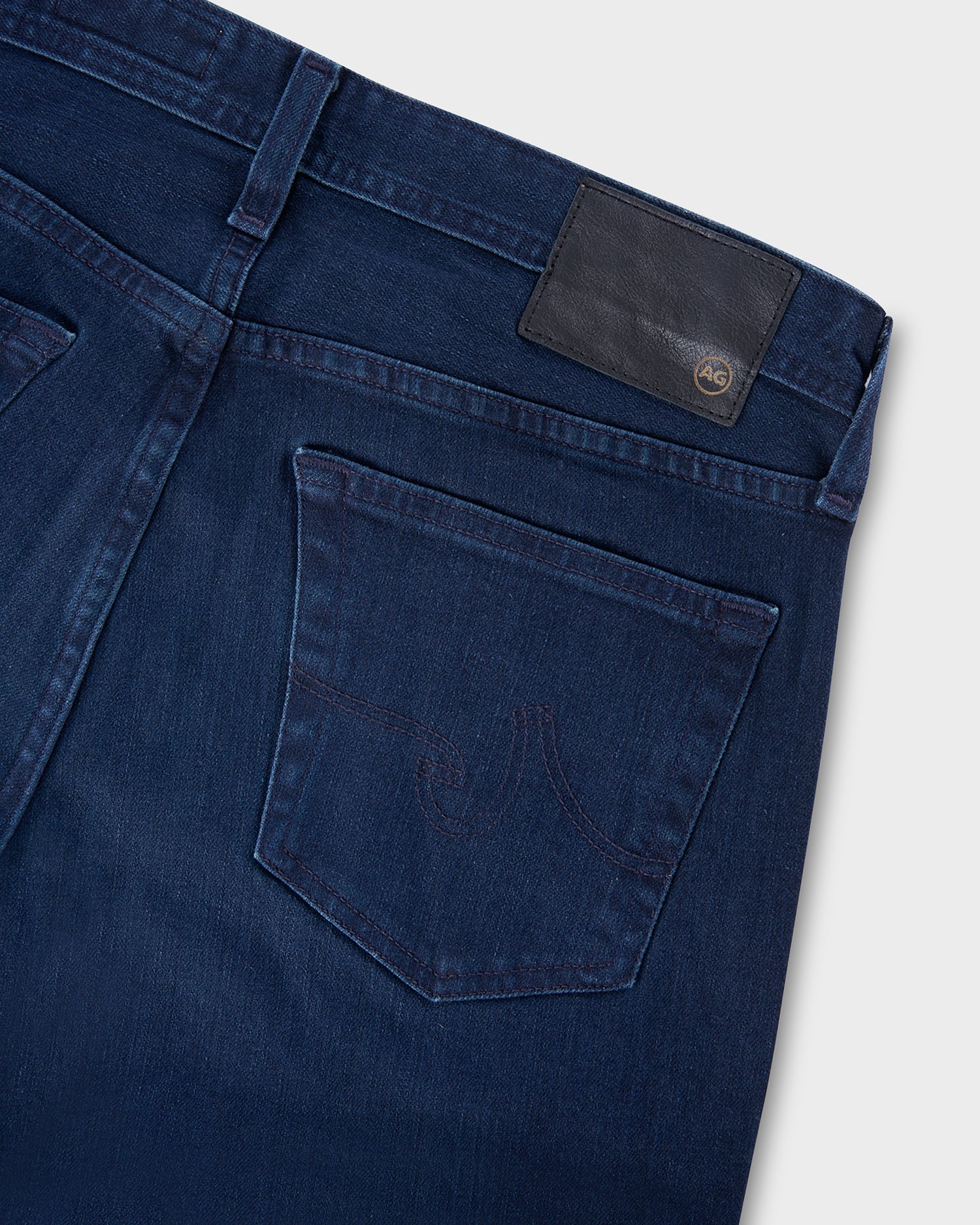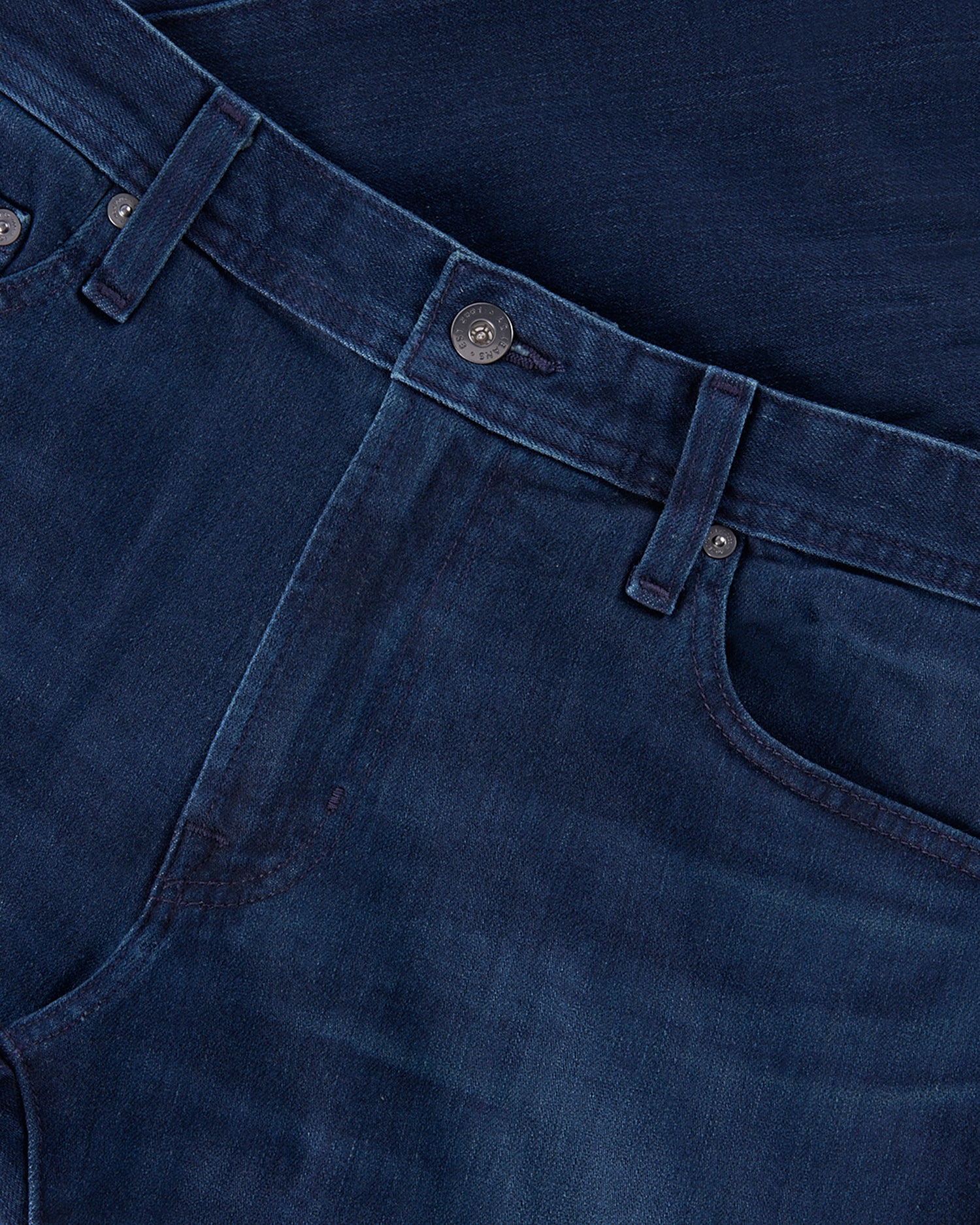 The Dylan tailored slim men's jeans have a deep, dark indigo wash in 10 oz. Empower Denim from Japan. Blended with movement-friendly stretch, the style is cut slim through the thighs and then tapers down at the leg opening. Subtle whiskering and contrast stitching accent the five-pocket design.