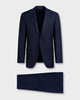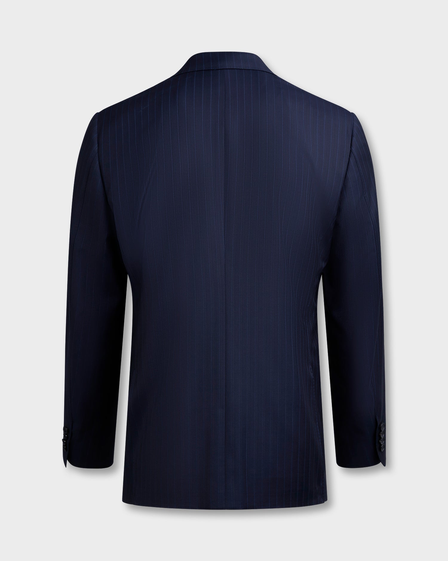 This is a dark navy suit with a subtle blue pinstripe by Canali, crafted in Italy from exceptional Super 150s wool. Fully lined and tailored with a notch lapel, flap pockets and double vents, it offers a precise, fluid silhouette with a naturally soft handle. The fine cloth and understated pattern speak to a quiet, assured elegance suited to both business and formal settings.