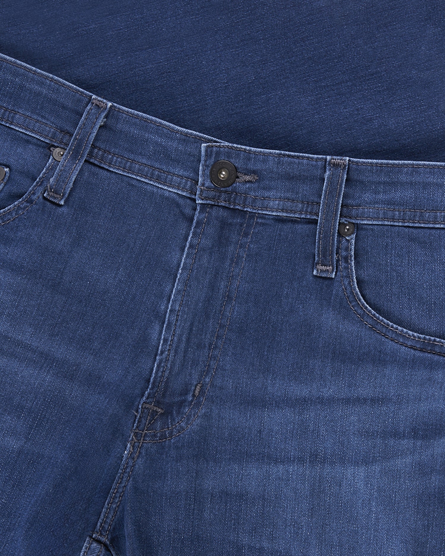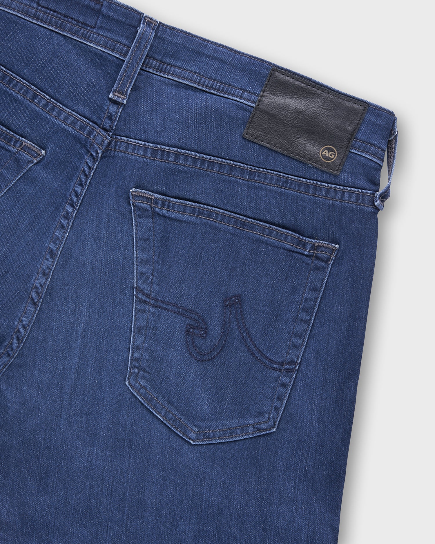 The Tellis modern slim jean for men features a saturated indigo shade and tonal stitching. Designed with fitted upper block and tapered leg openings, these five-pocket men's jeans are crafted from Japanese denim with a worn in whiskered look.