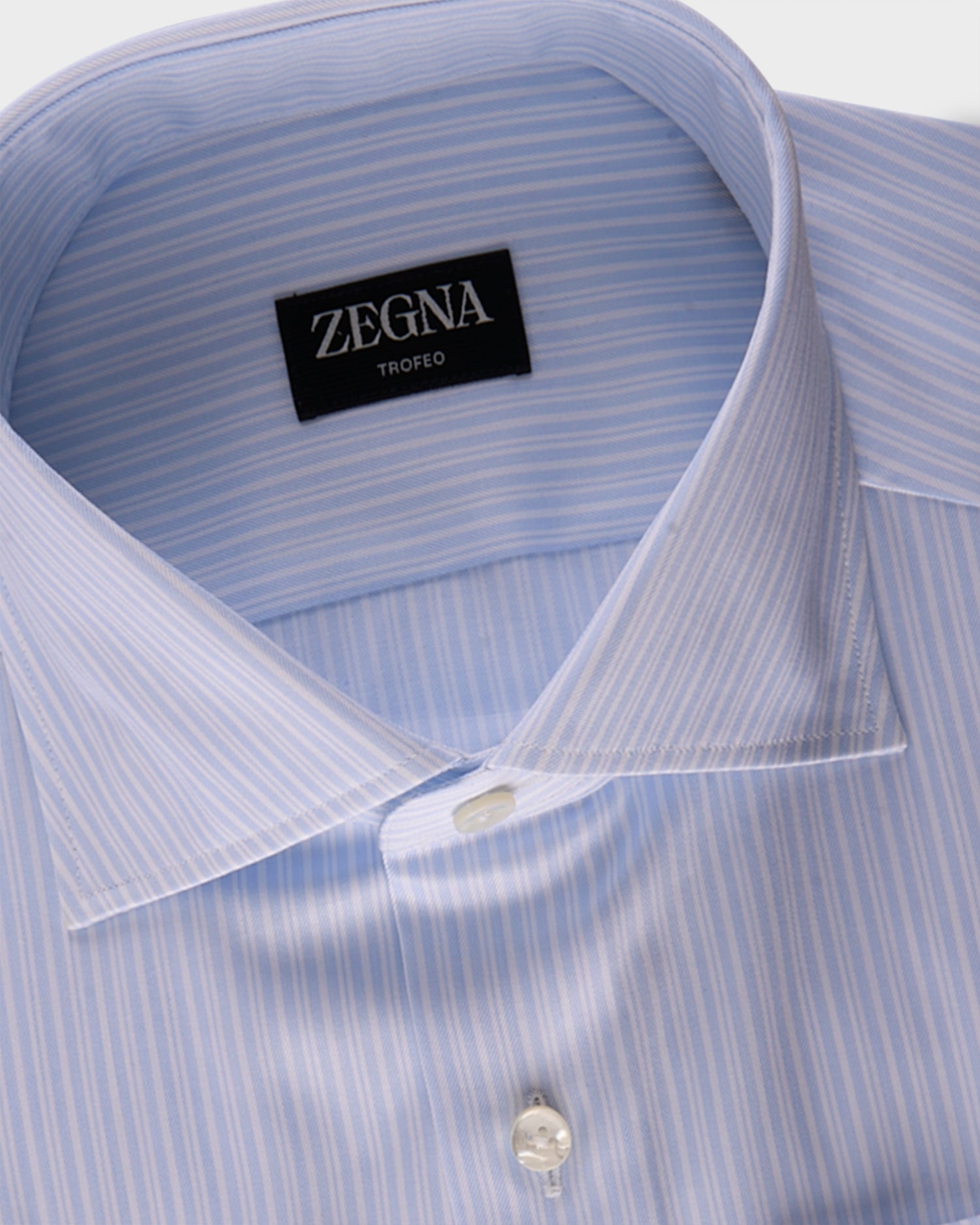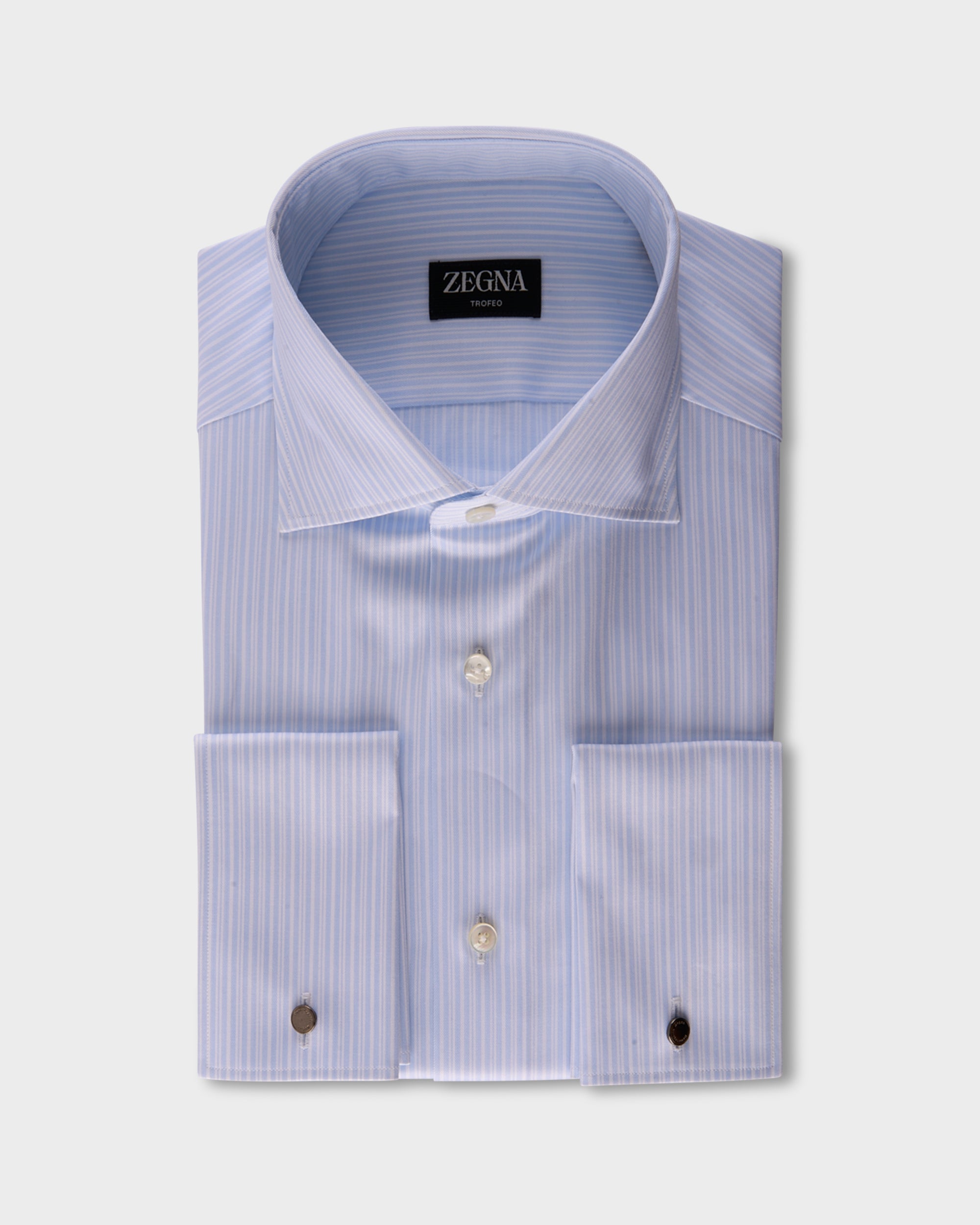 Crafted from pure Trofeo™ cotton, only the longest, more elastic fibers are hand-picked to grant this pale blue and white stripe shirt its premium quality and performance. The classic button-up is styled with a semi spread collar and french cuffs.