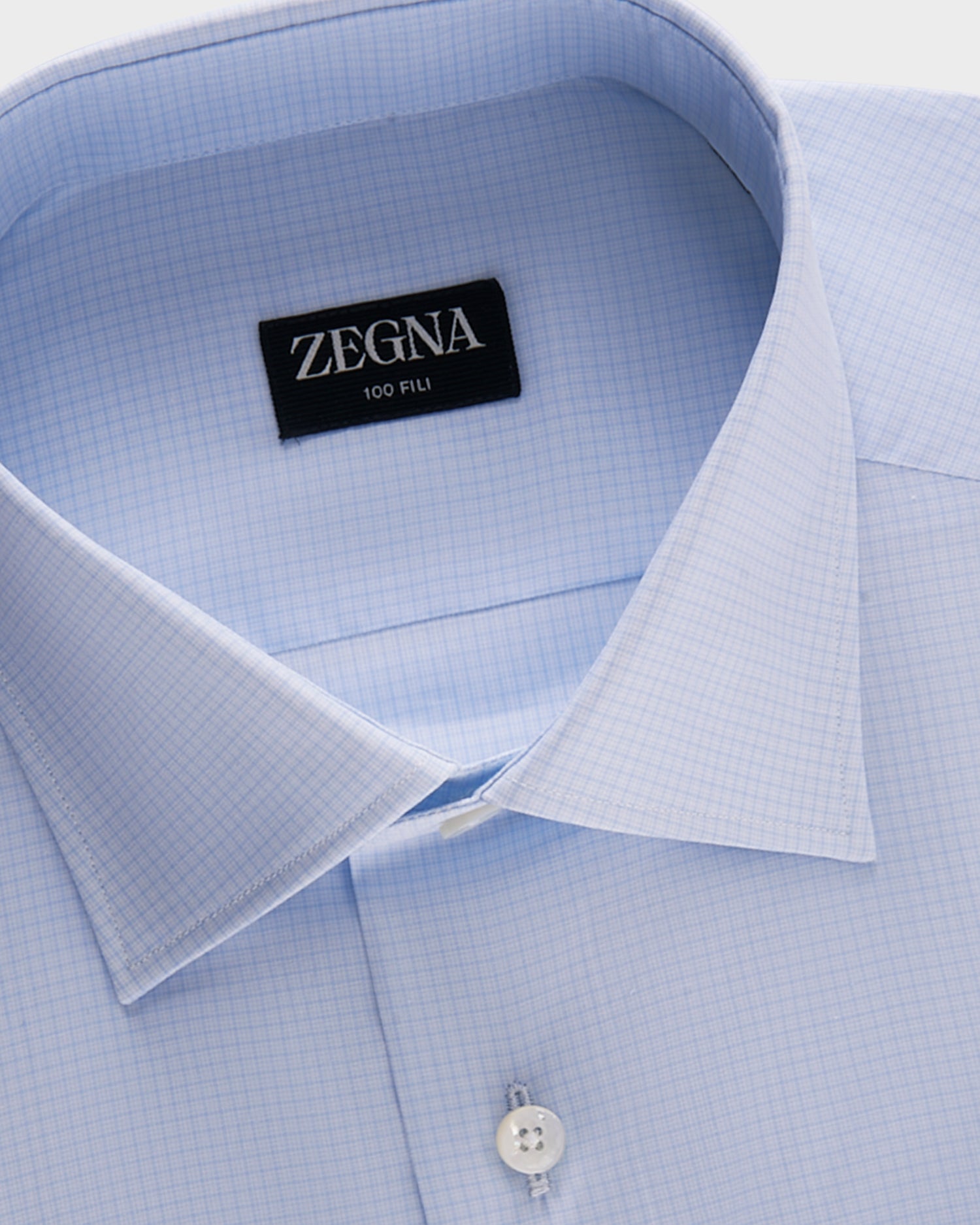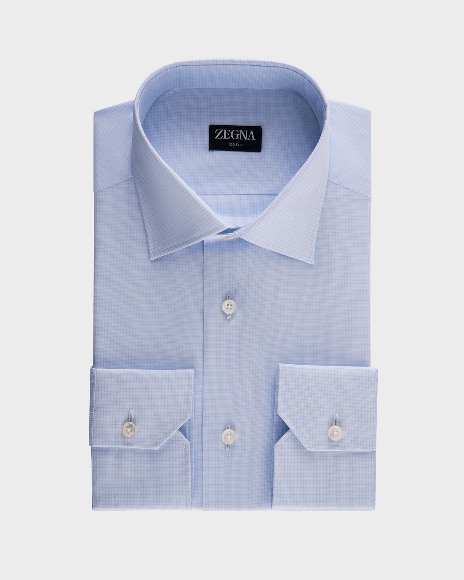 The light blue check 100fili cotton long-sleeve tailoring shirt is named from its exceptionally high thread count, which gives the silky material has a natural sheen. This luminous quality enhances the understated colourway. Meticulously crafted details complete the tailored look.