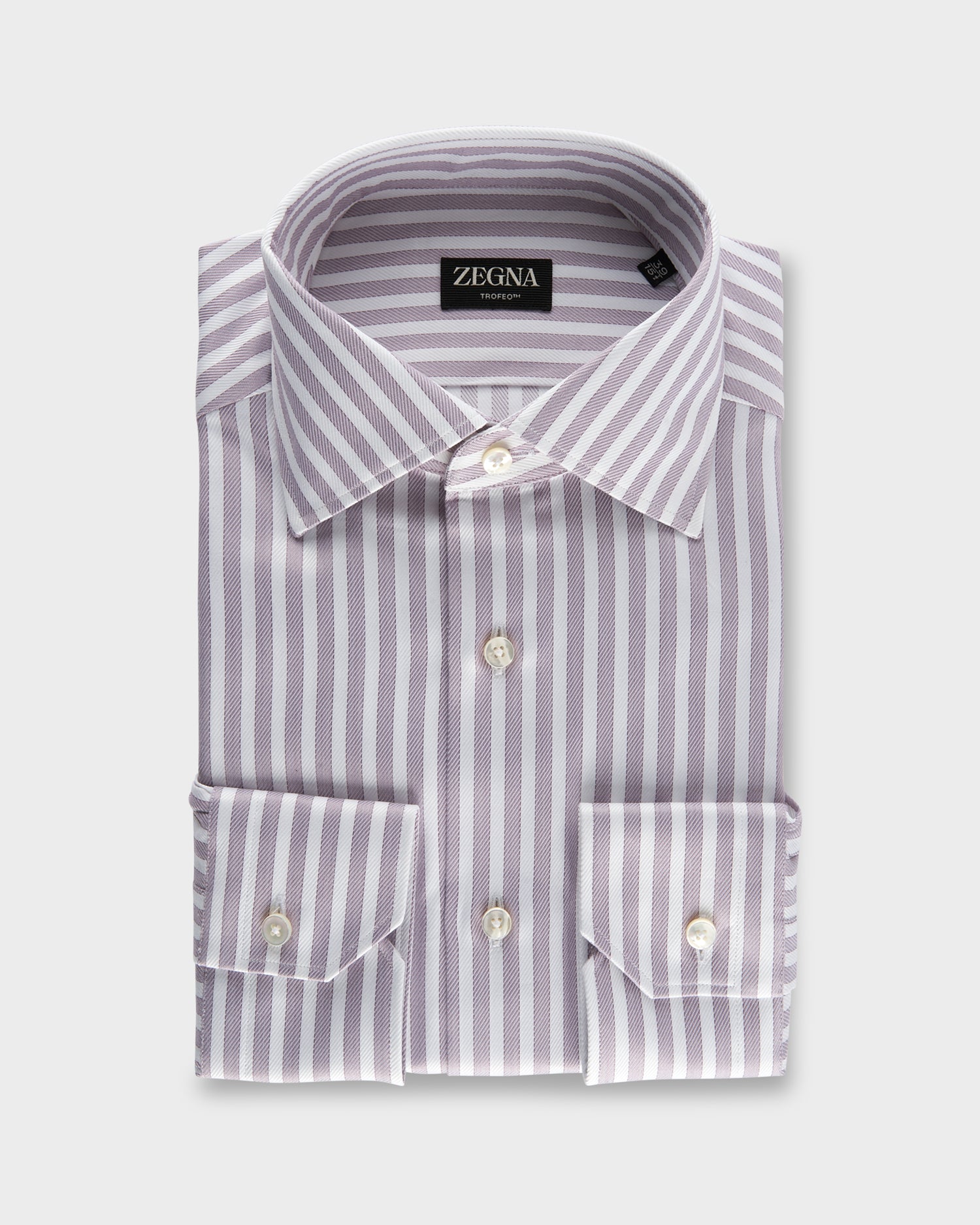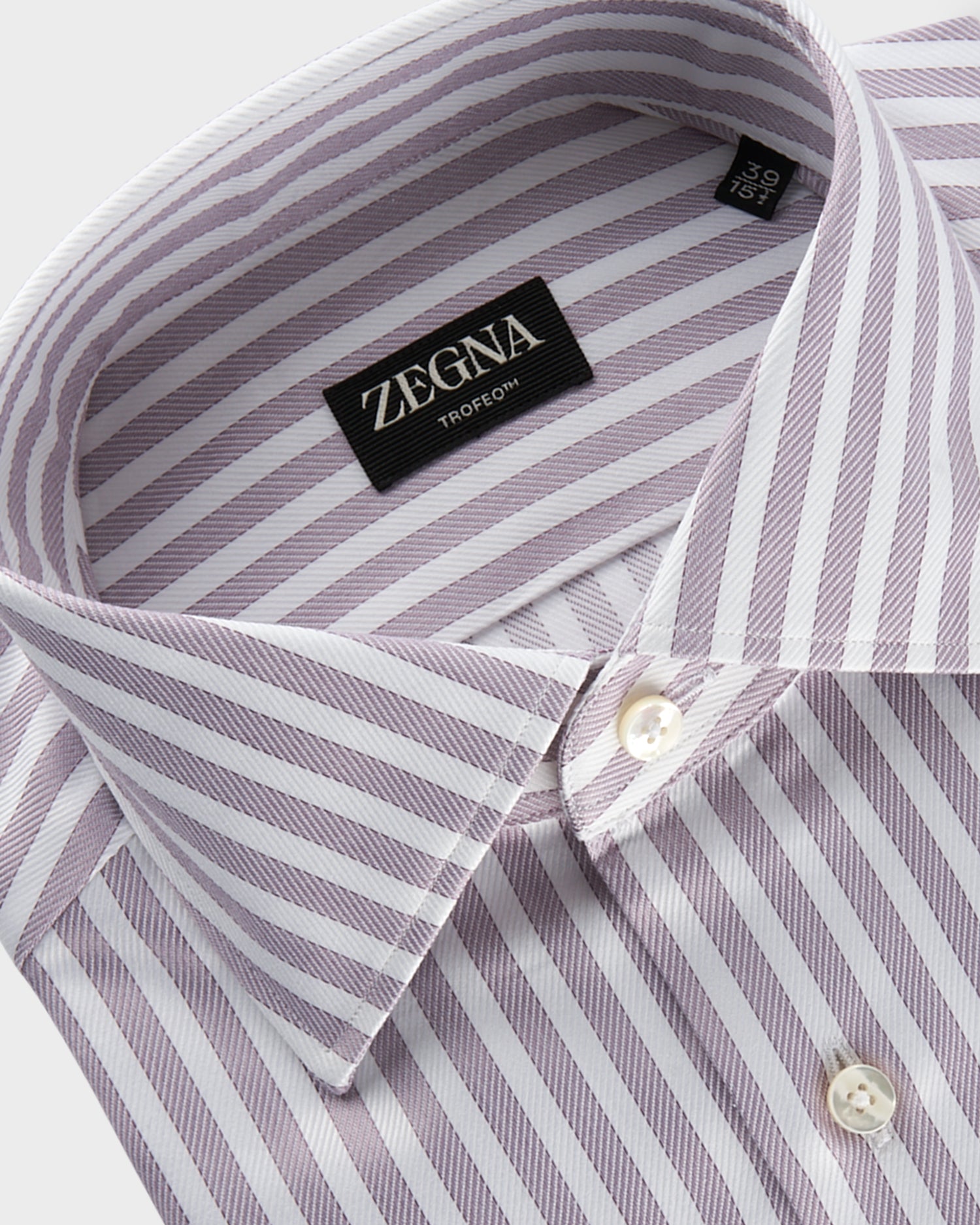 This Trofeo cotton shirt with a bold solid stripe pattern in white and mauve elevates a wardrobe staple with its luxurious fabric developed from premium Trofeo cotton. The hand-picked, long fibers create silky smooth, wrinkle-resistant, and high-performing garments, perfect for everyday wear. The long-sleeved shirt is styled with a semi-spread collar and standard cuffs.