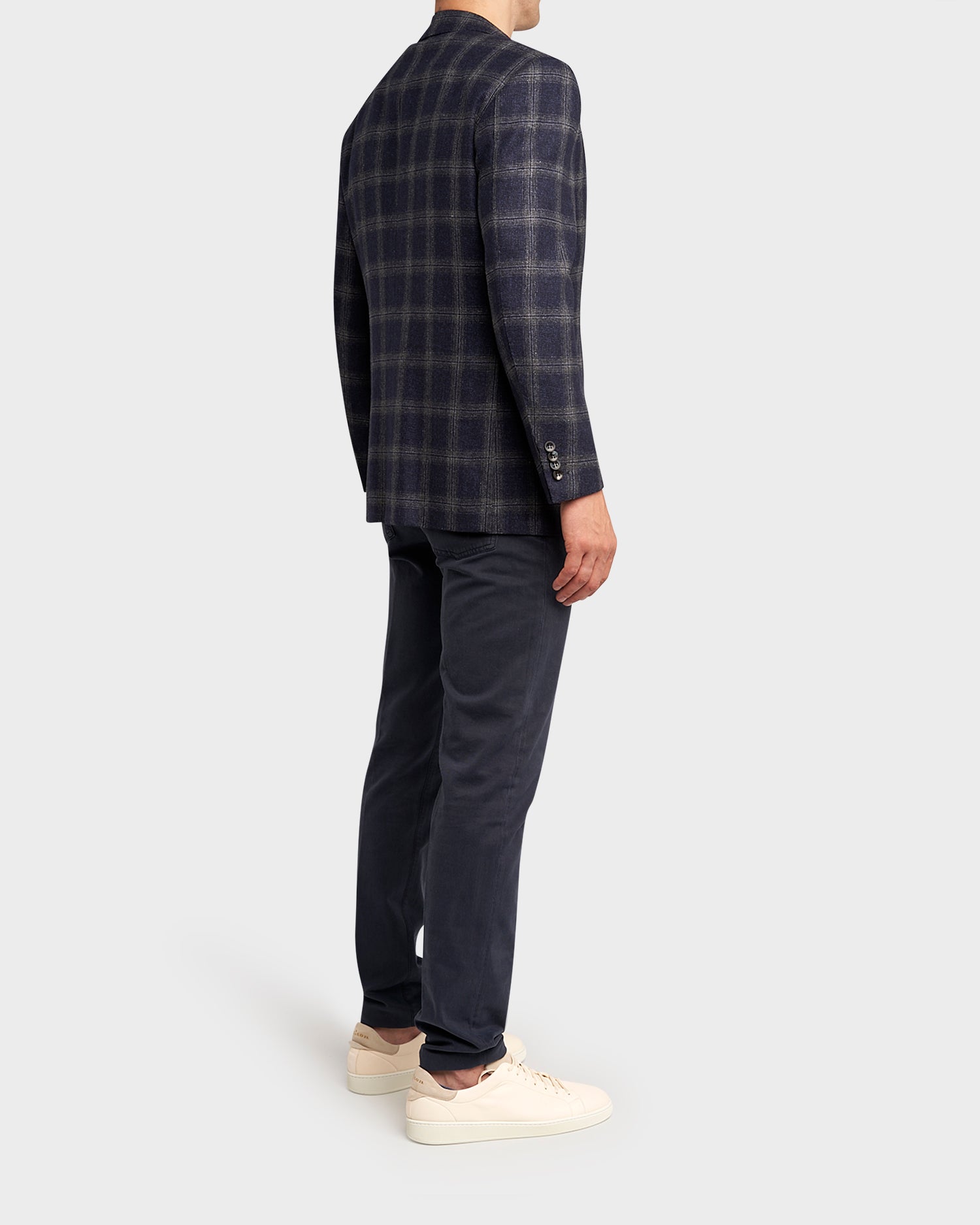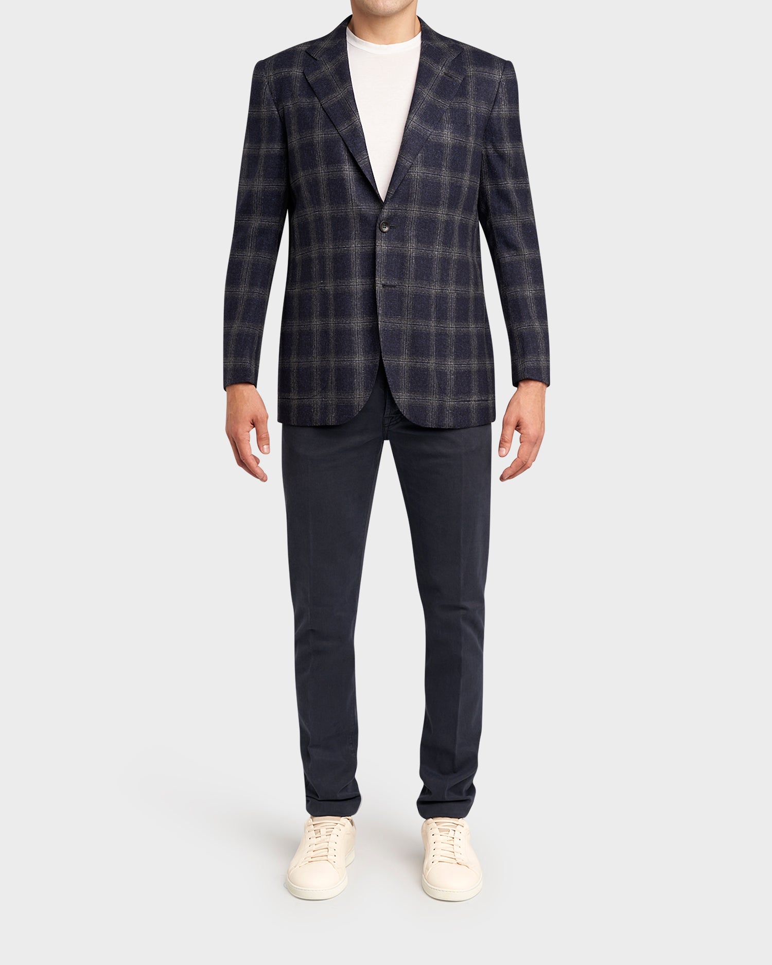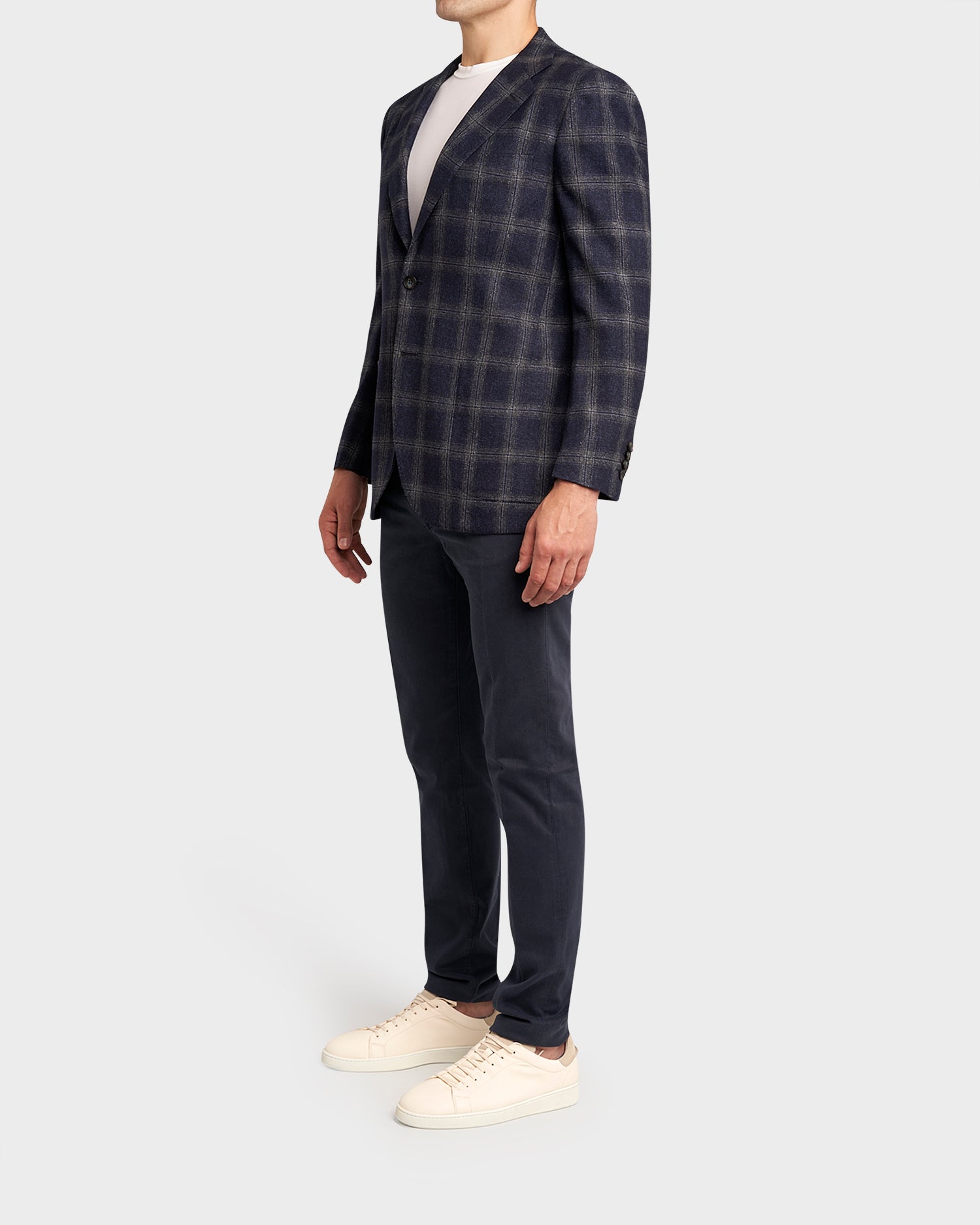 Single-breasted jacket with a check motif, made from an exclusive blend of wool, silk and linen interweaving shades of navy and grey. Finely crafted textiles have always been a cornerstone at Kiton, with wools coming from their Biella mill in Italy.