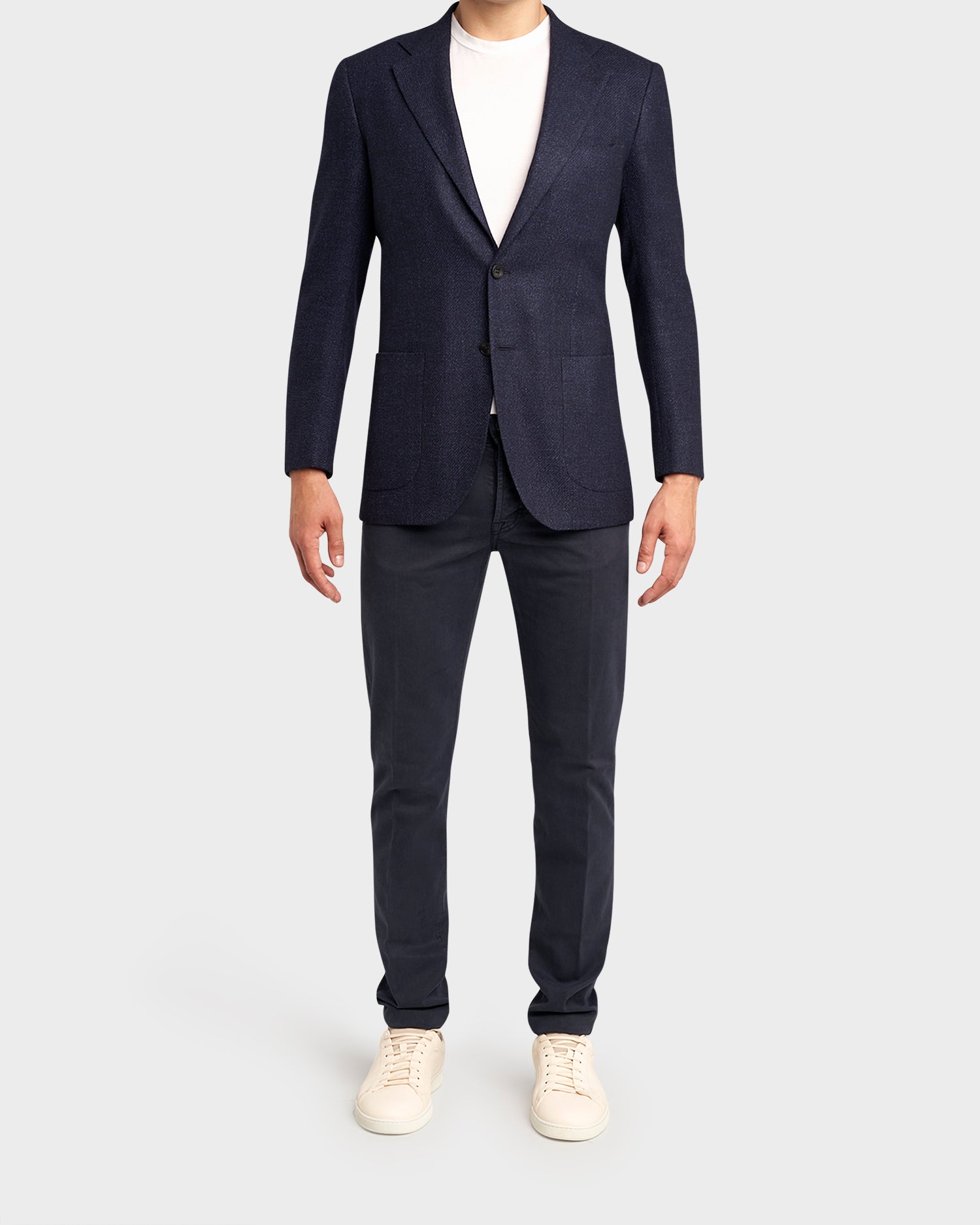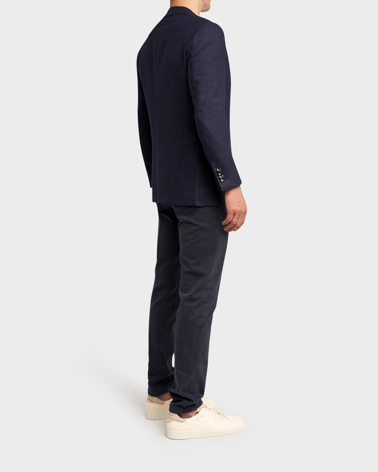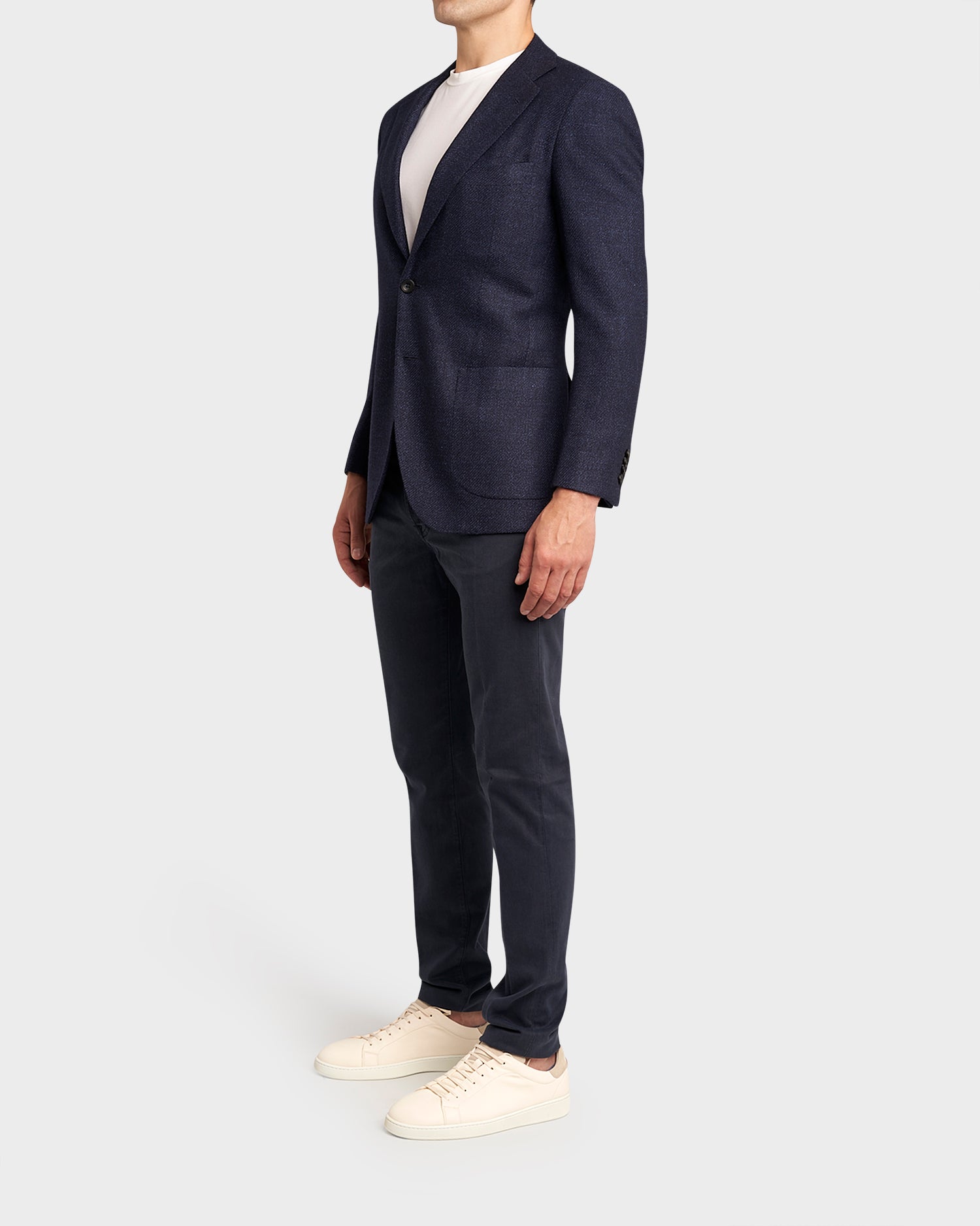 Single-breasted jacket with in a cavalry twill, made from an exclusive blend of wool, silk and linen interweaving shades of navy and grey. Finely crafted textiles have always been a cornerstone at Kiton, with wools coming from their Biella mill in Italy.
