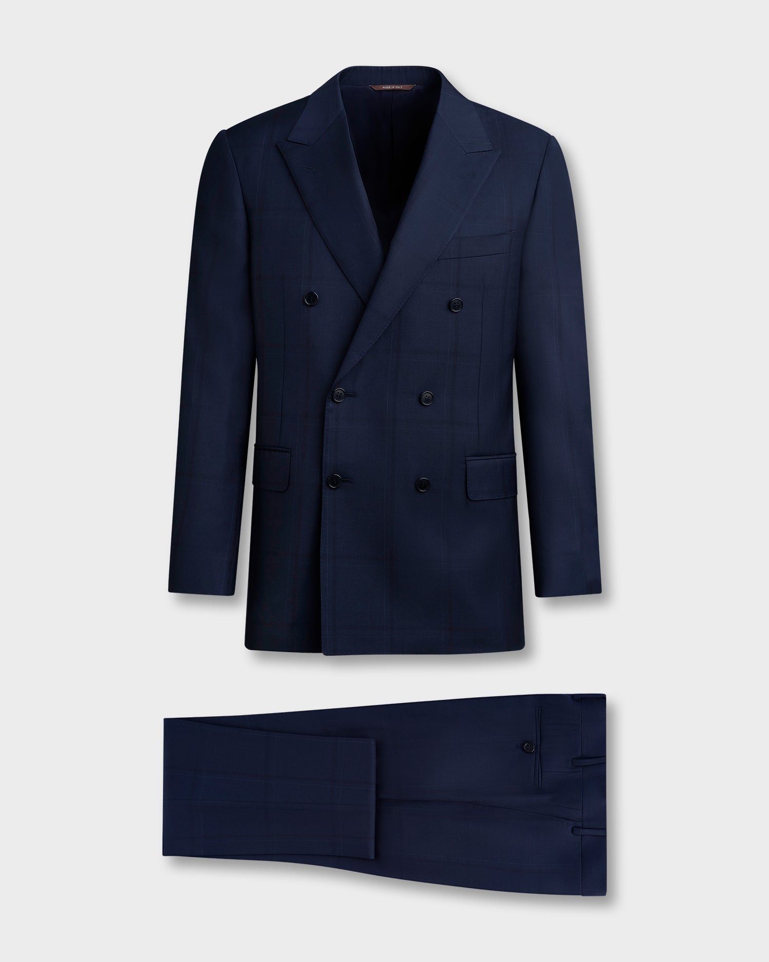 A confident expression of modern tailoring, this double-breasted suit from Canali is crafted from pure wool in a rich navy tone, elevated by a large yet understated overcheck. The structured silhouette is balanced with soft Italian construction, offering both presence and ease of wear. Finished with classic flap pockets and meticulous detailing, it delivers a refined statement suited to both business and formal occasions.