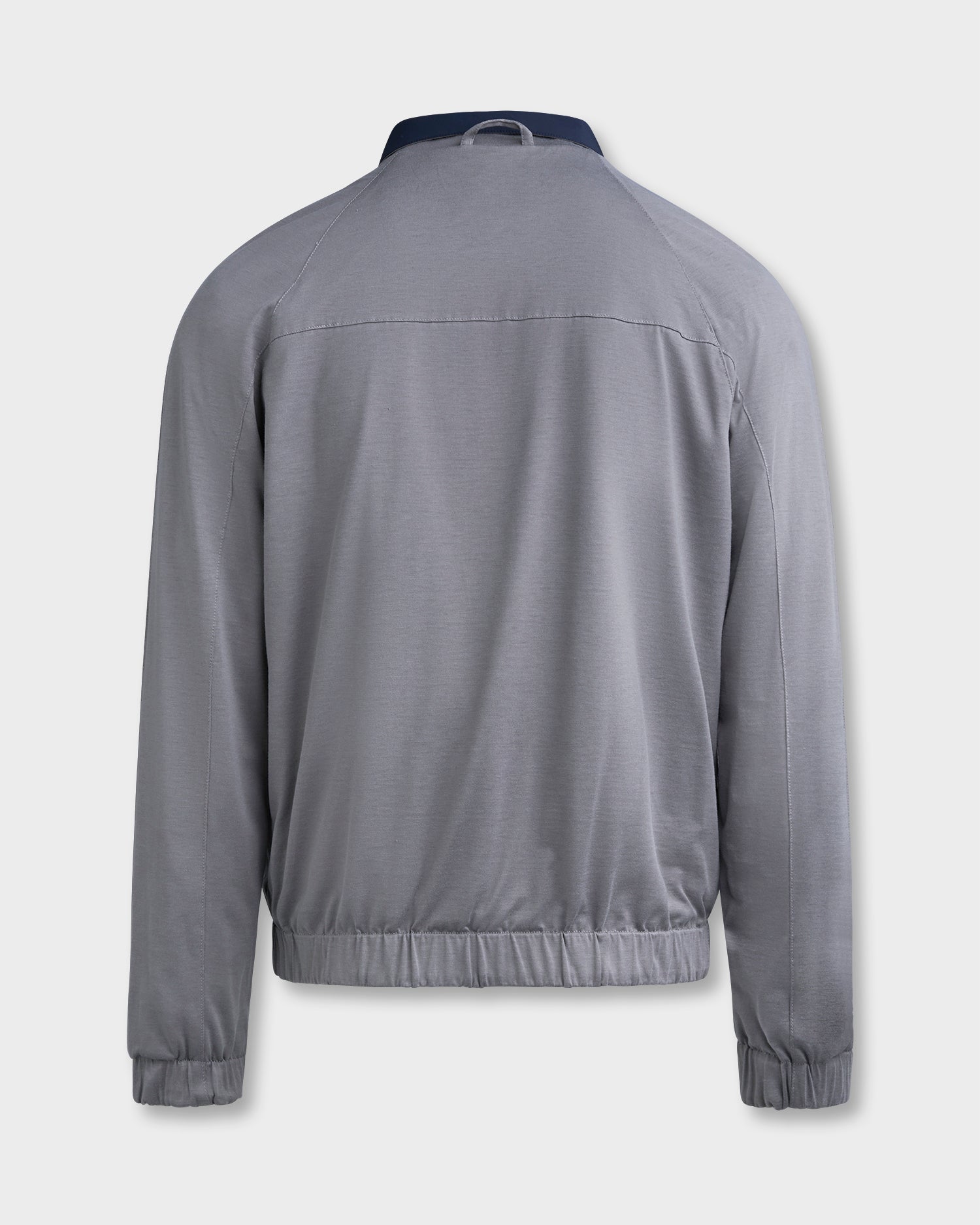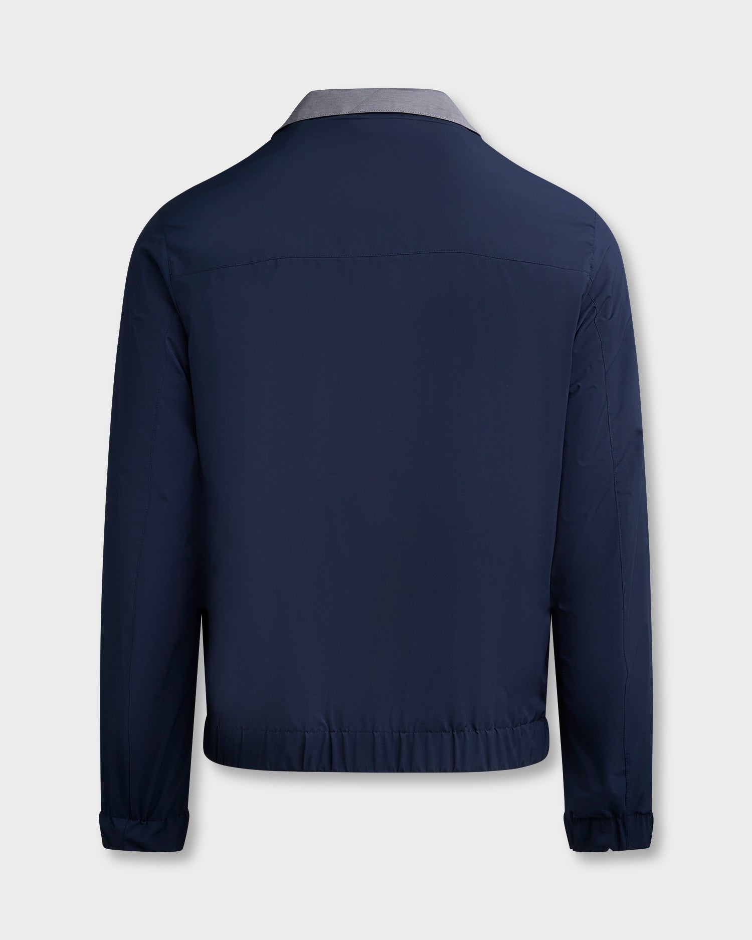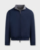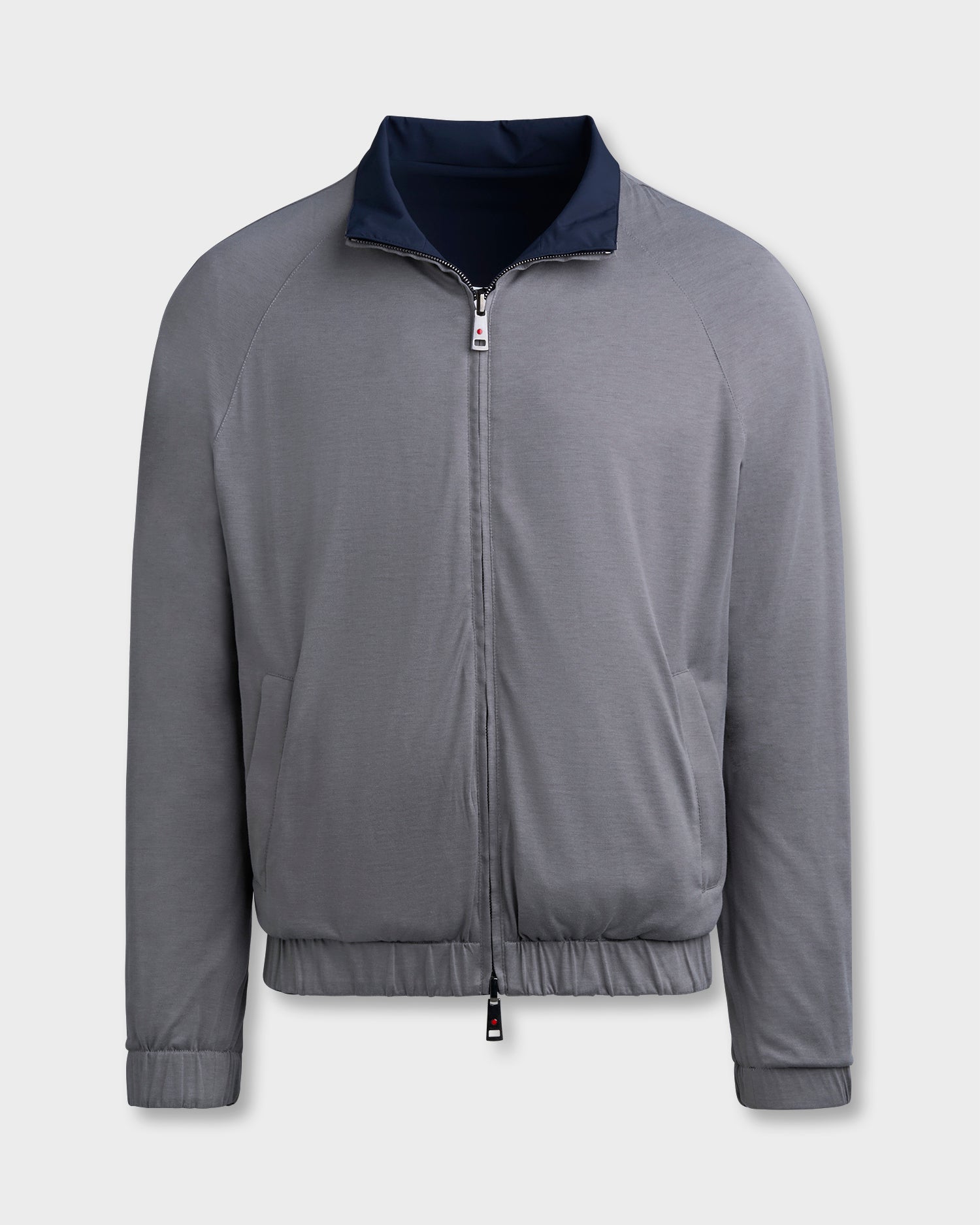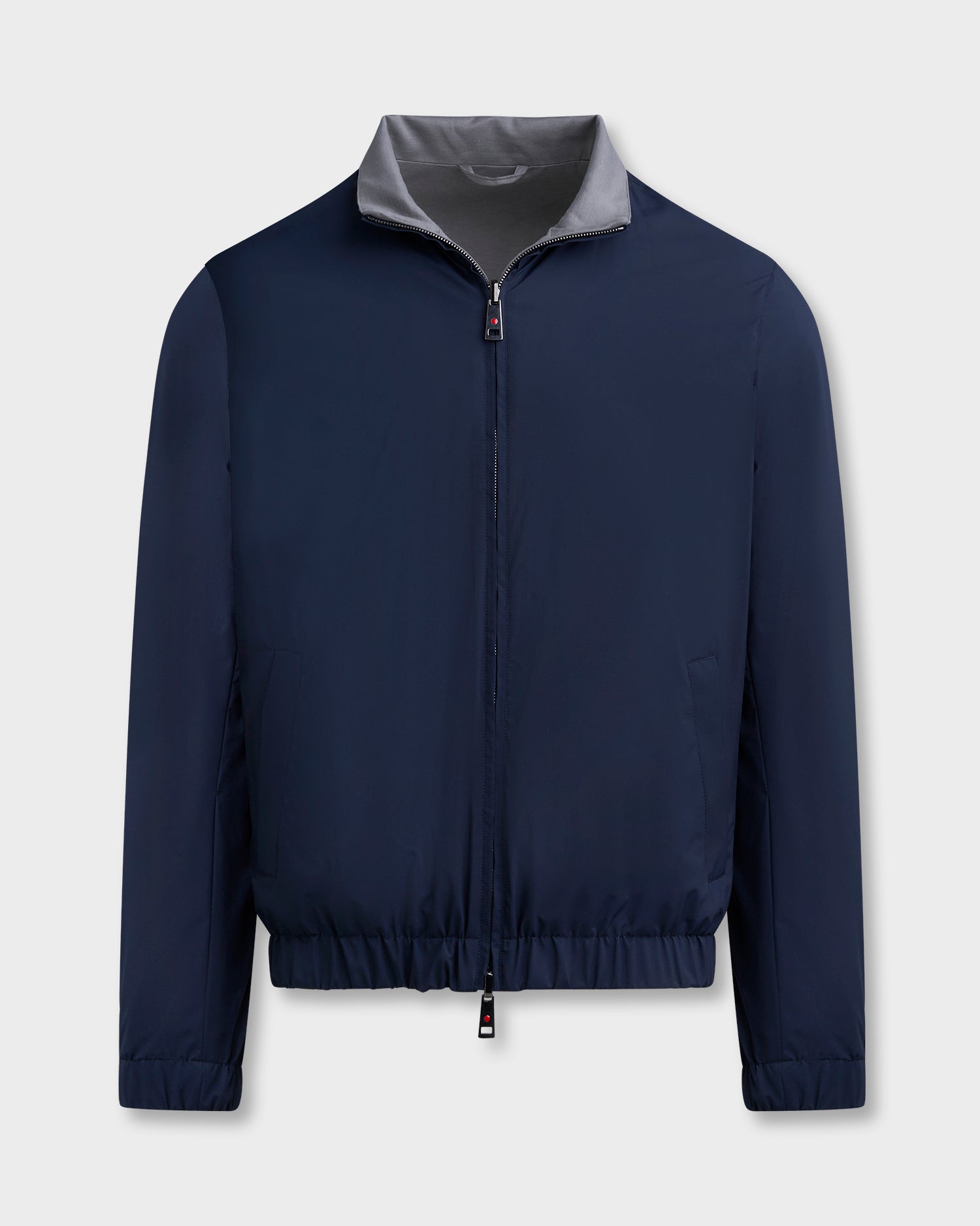 A reversible bomber jacket designed to move easily between polished and practical. One side is crafted in navy technical poly for light rain protection, while the reverse reveals soft grey jersey in pure virgin wool. Finished with a two-way zip, it offers a versatile layer that balances comfort, function, and understated style.