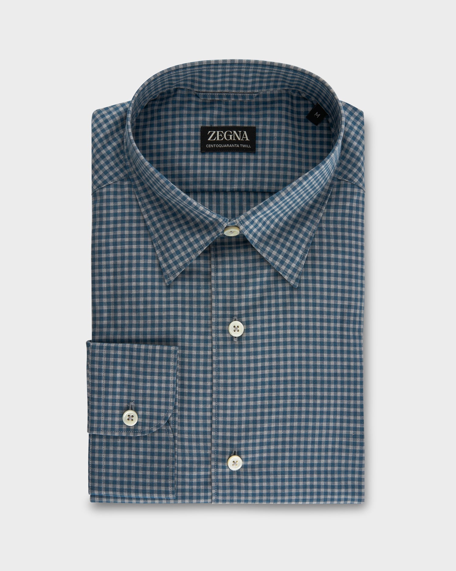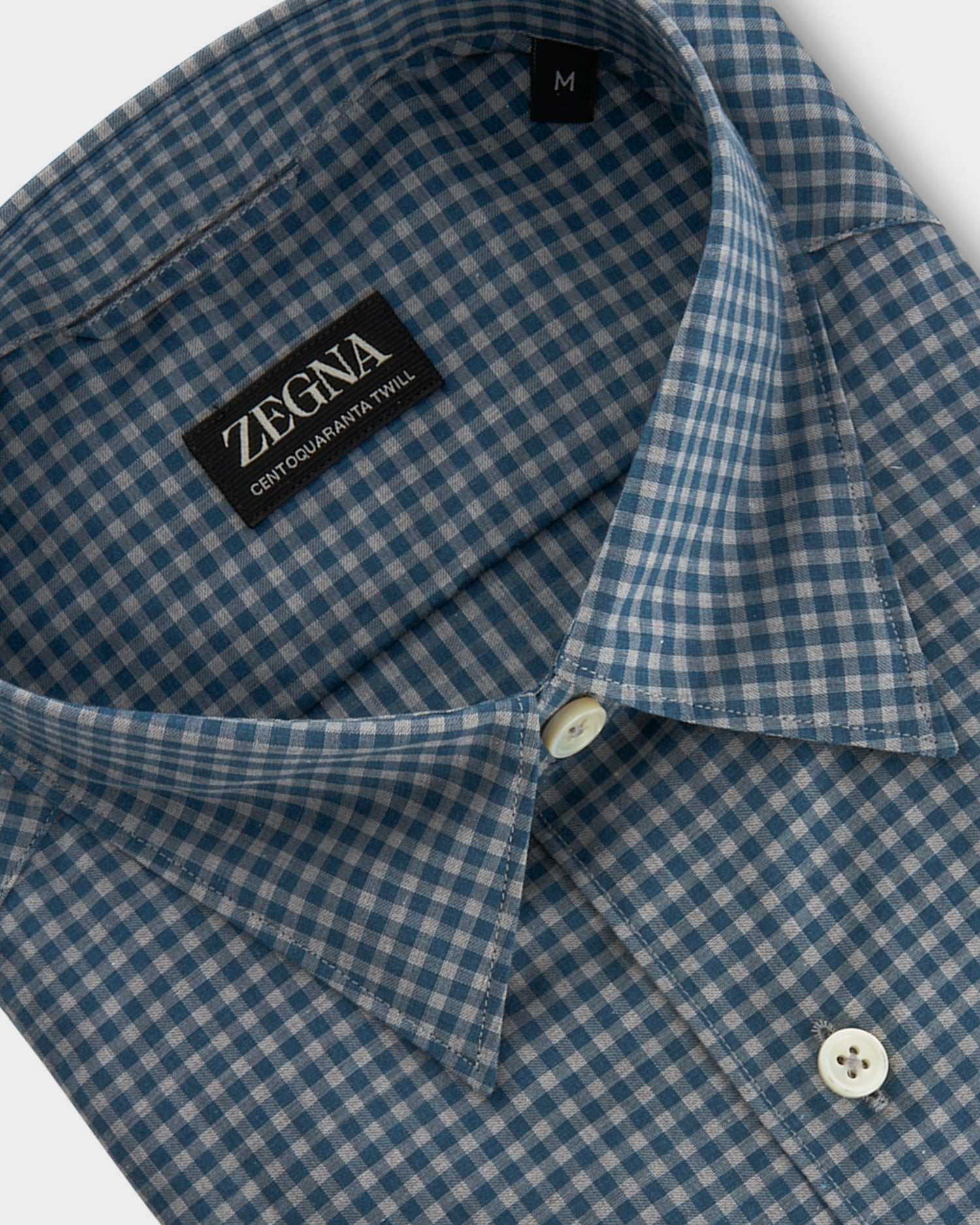 Zegna's refined, teal blue Centoquaranta twill cotton shirt draws the eye with a sophisticated gingham pattern. The understated colours breathe new life into the classic design, adding eye-catching dimension to elegant wardrobes.