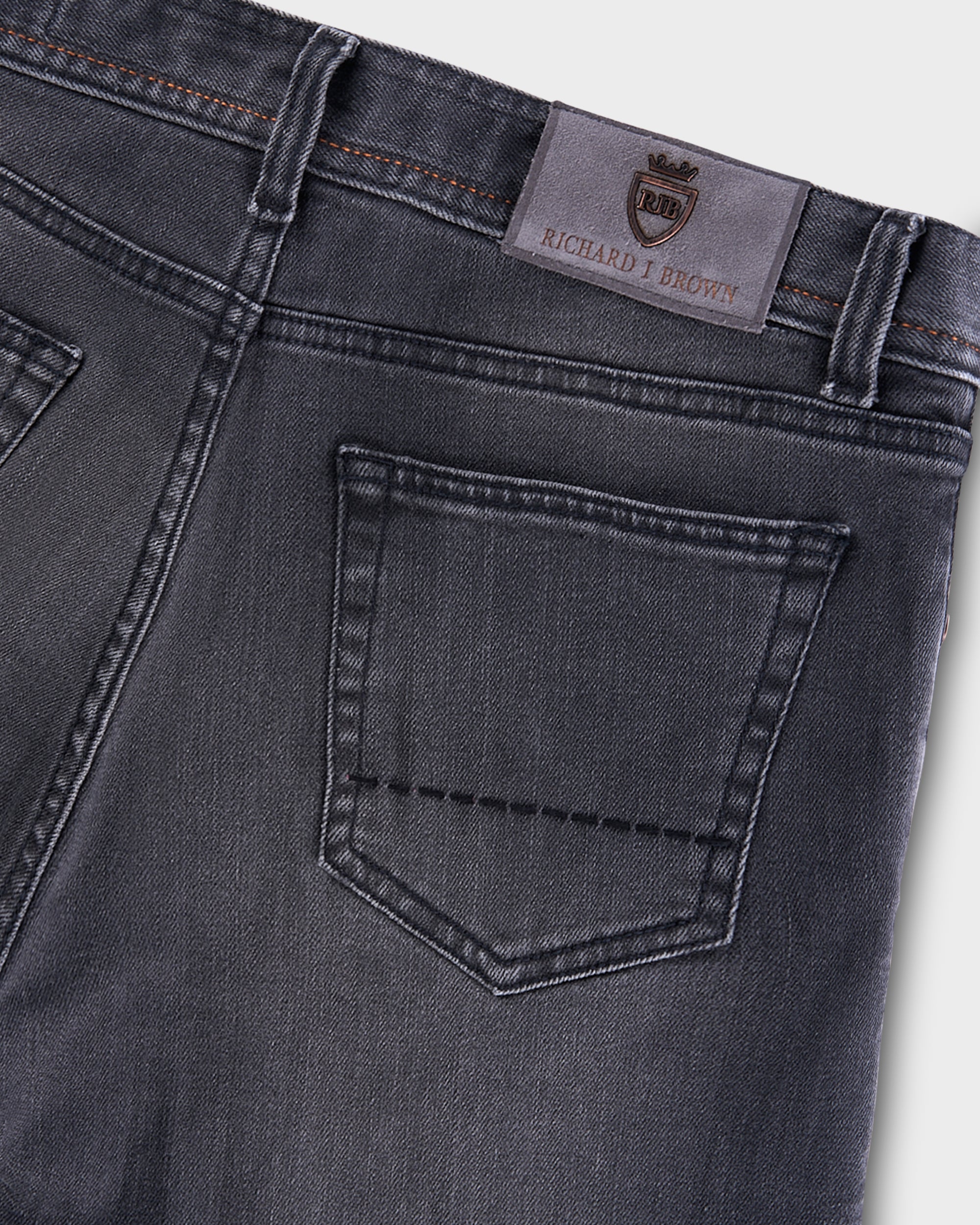 The hallmark of any RJB trouser is the hand stitching on the back pockets sewn by expert embroiderers with the finest yarns. The yarn used reflects the colours used for the rich and important patch, in several versions, from suede to nubby fabrics and enriched with an embossed or galvanized metal logo.
