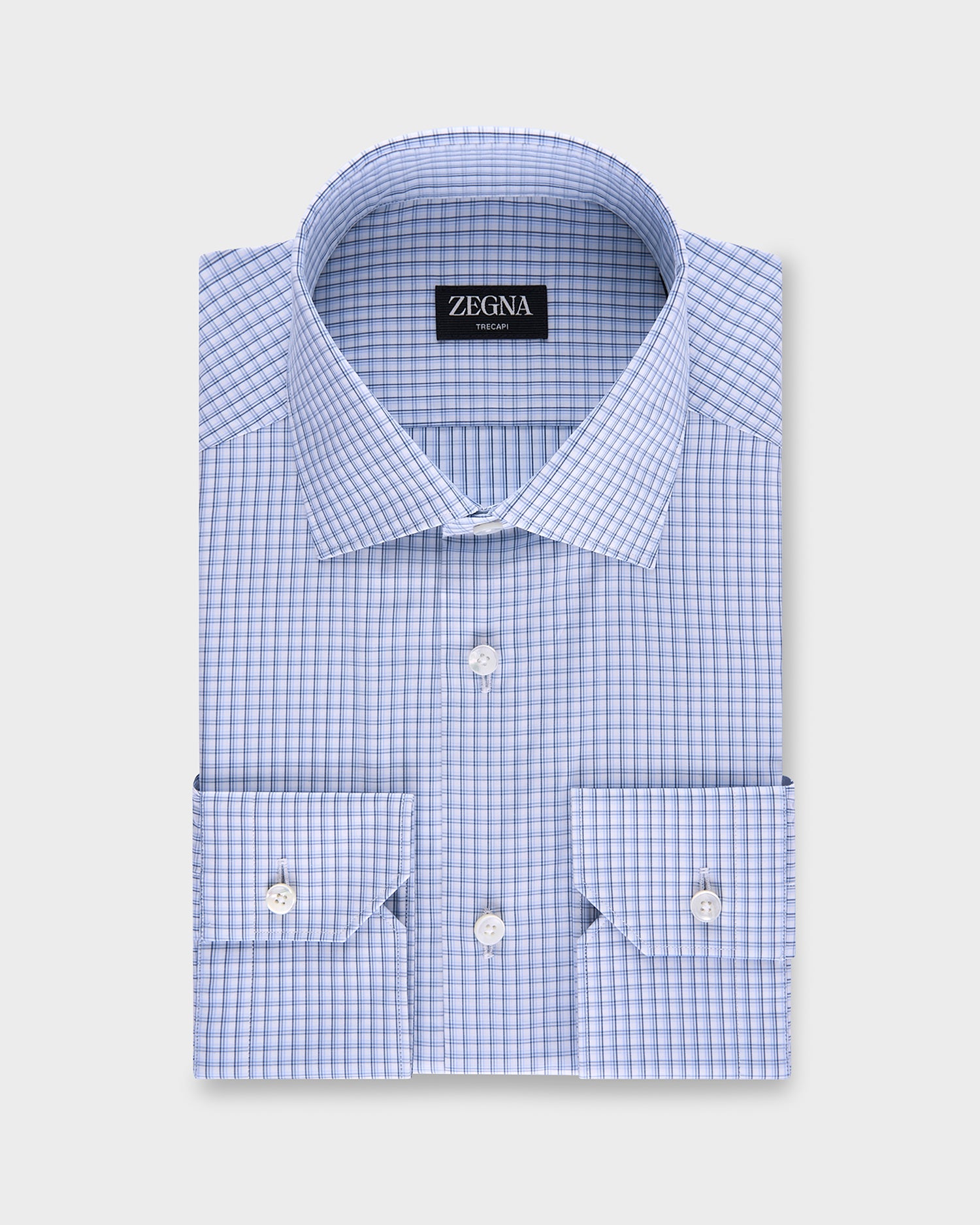 Made from superior Trecapi cotton, this shirt feels impeccably smooth whilst promising exceptional durability. Bringing timeless allure to any look with its white and light blue fine check pattern, it features a smart semi-spread collar and a rounded hem.