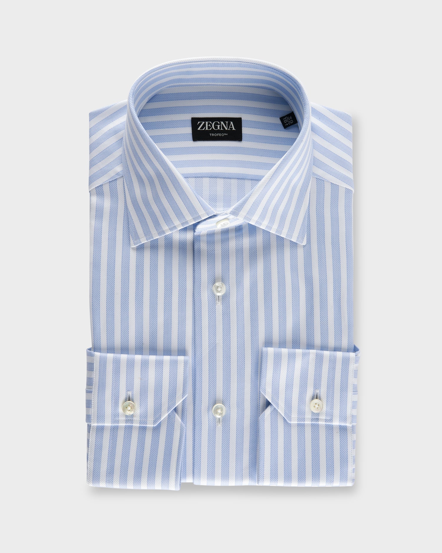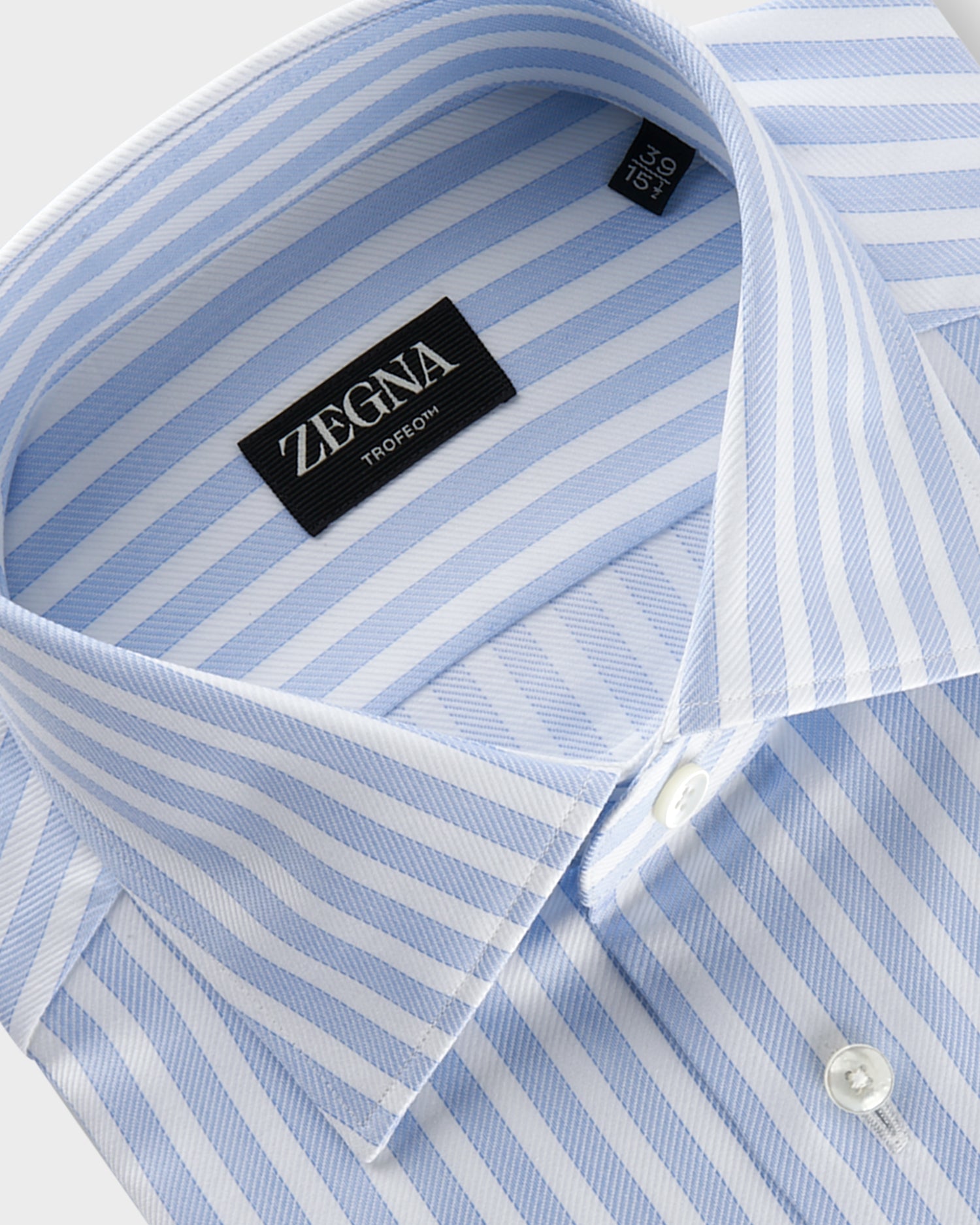 This Trofeo cotton shirt with a bold solid stripe pattern in white and blue elevates a wardrobe staple with its luxurious fabric developed from premium Trofeo cotton. The hand-picked, long fibers create silky smooth, wrinkle-resistant, and high-performing garments, perfect for everyday wear. The long-sleeved shirt is styled with a semi-spread collar and standard cuffs.