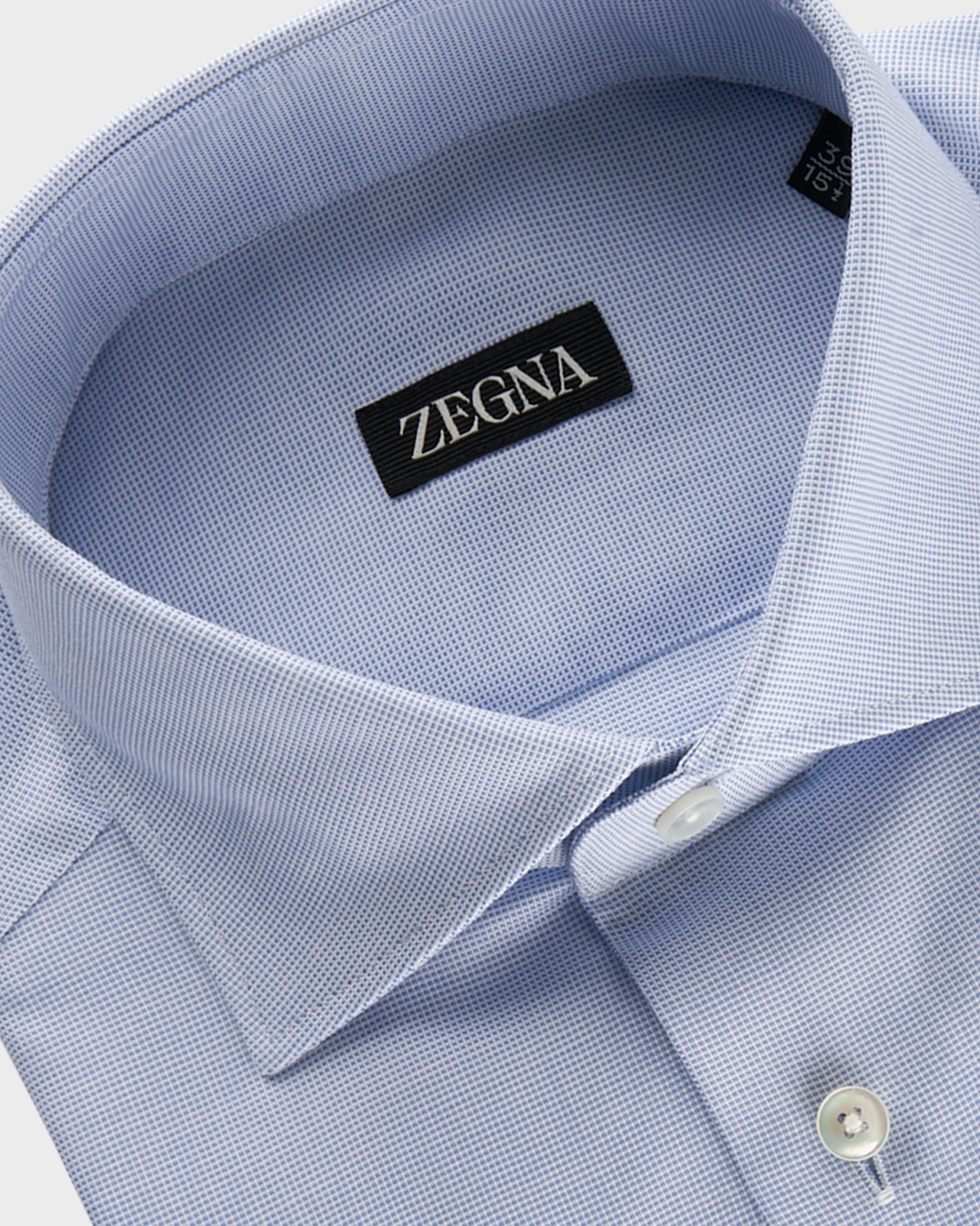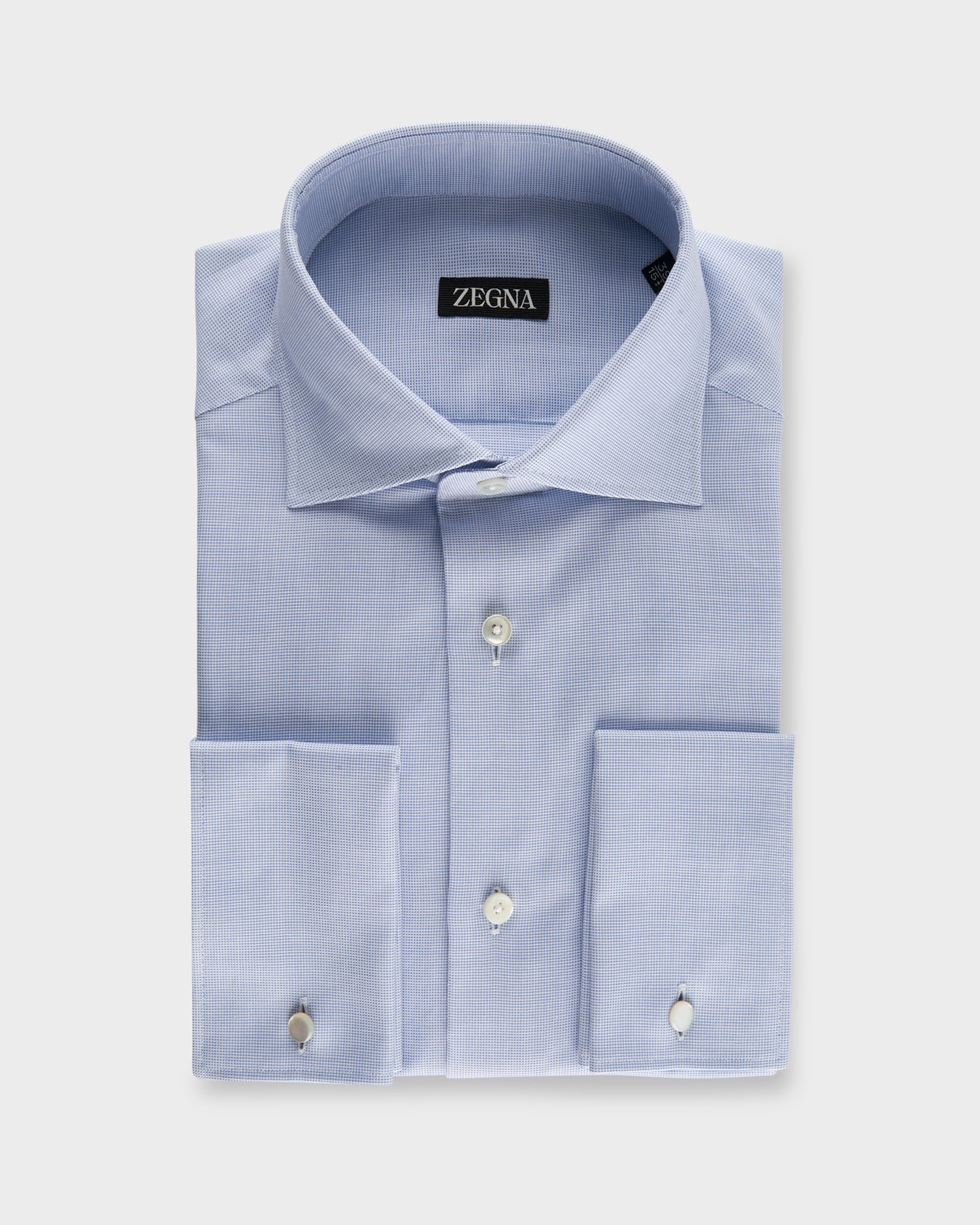 Crafted from pure Trofeo™ cotton, only the longest, more elastic fibers are hand-picked to grant this blue shirt its premium quality and performance. The classic button-up is enhanced with a microweave texture and styled with a spread collar and French cuffs.