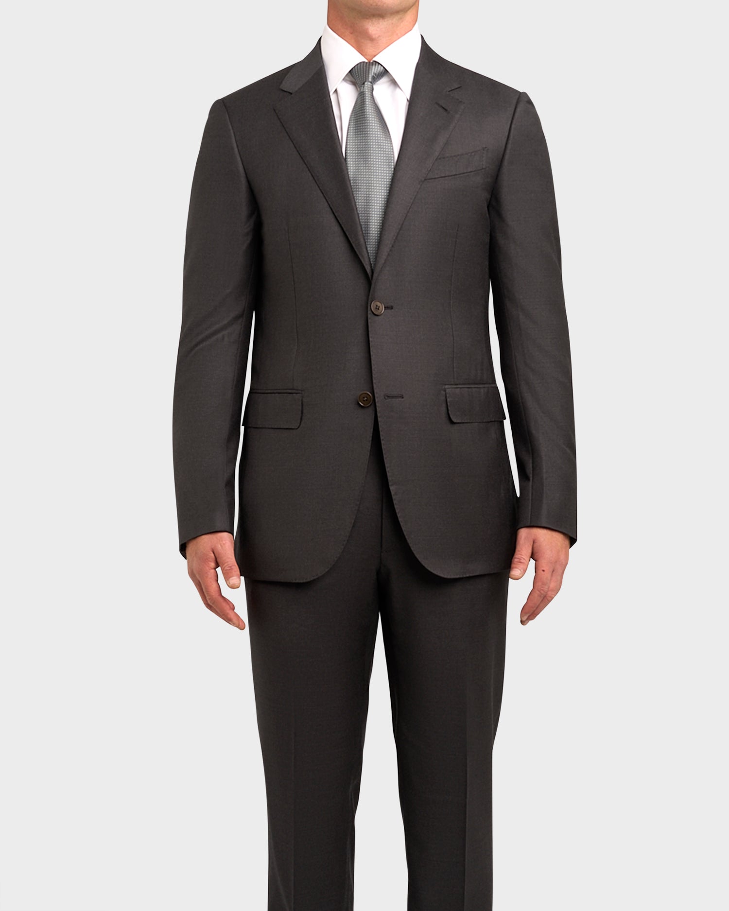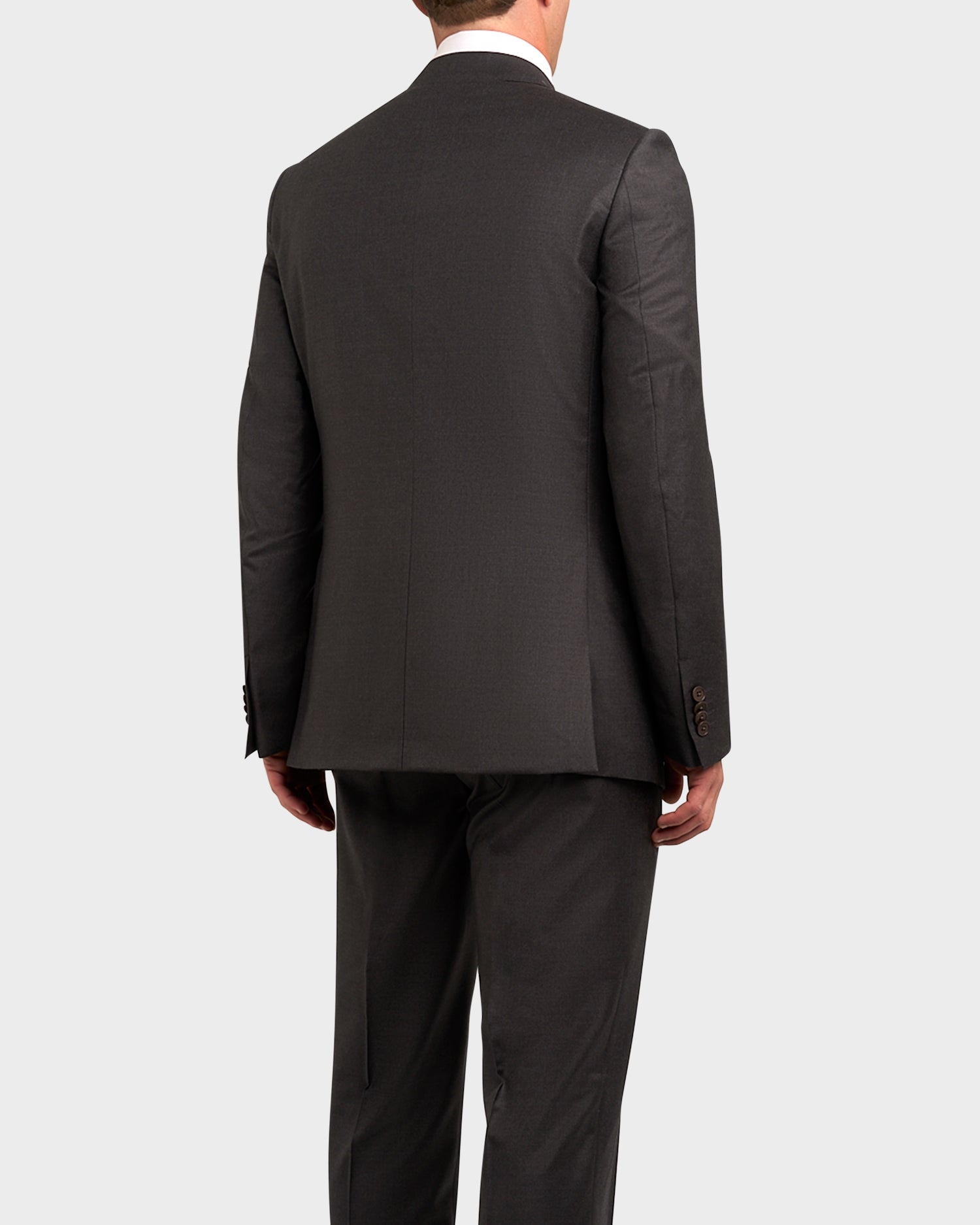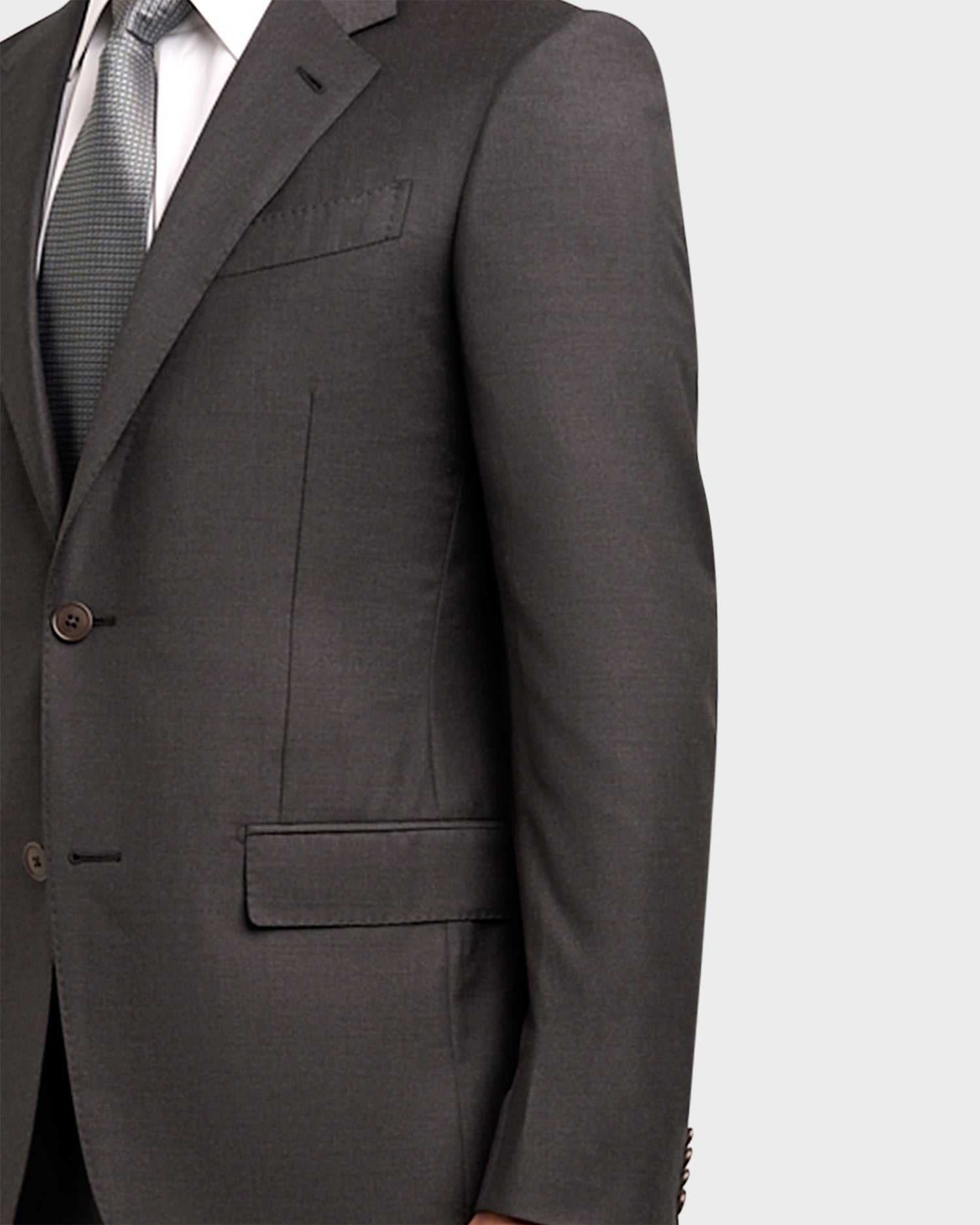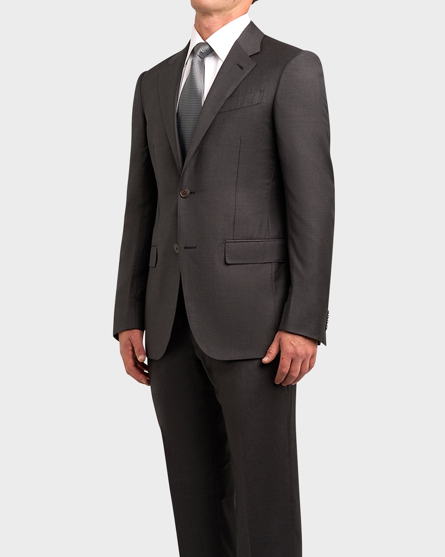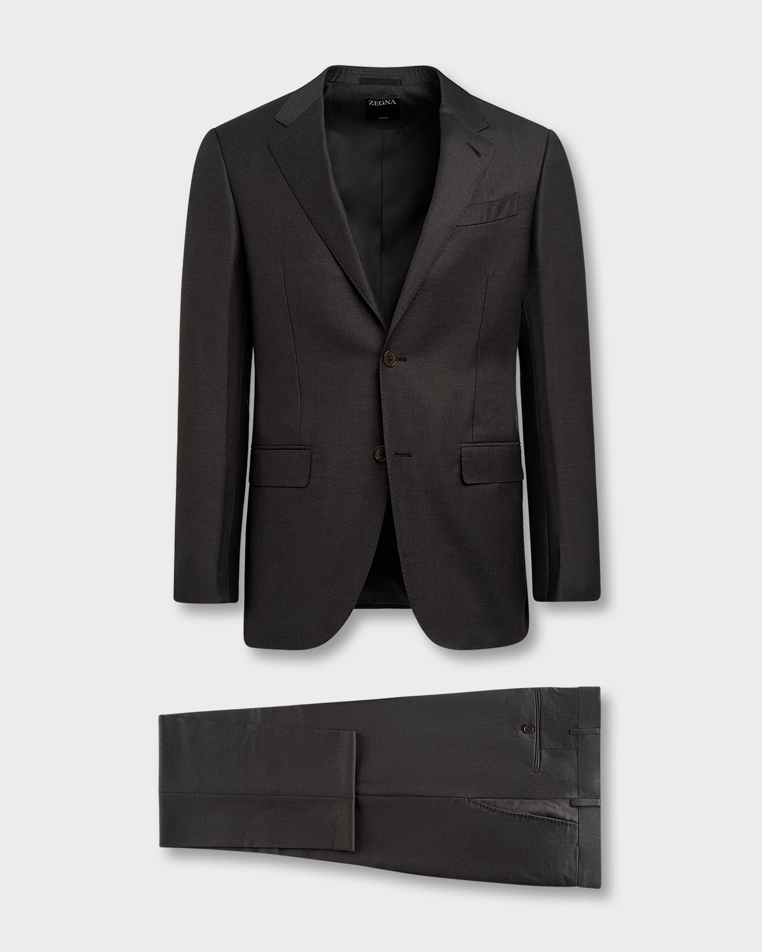 The charcoal grey Trofeo™ wool tailoring suit is made from Zegna's proprietary Australian merino wool. In addition to its superior comfort, this fabric's smooth finish is the perfect backdrop for the understated pattern. The deconstructed jacket is paired with dart-stitched pants.