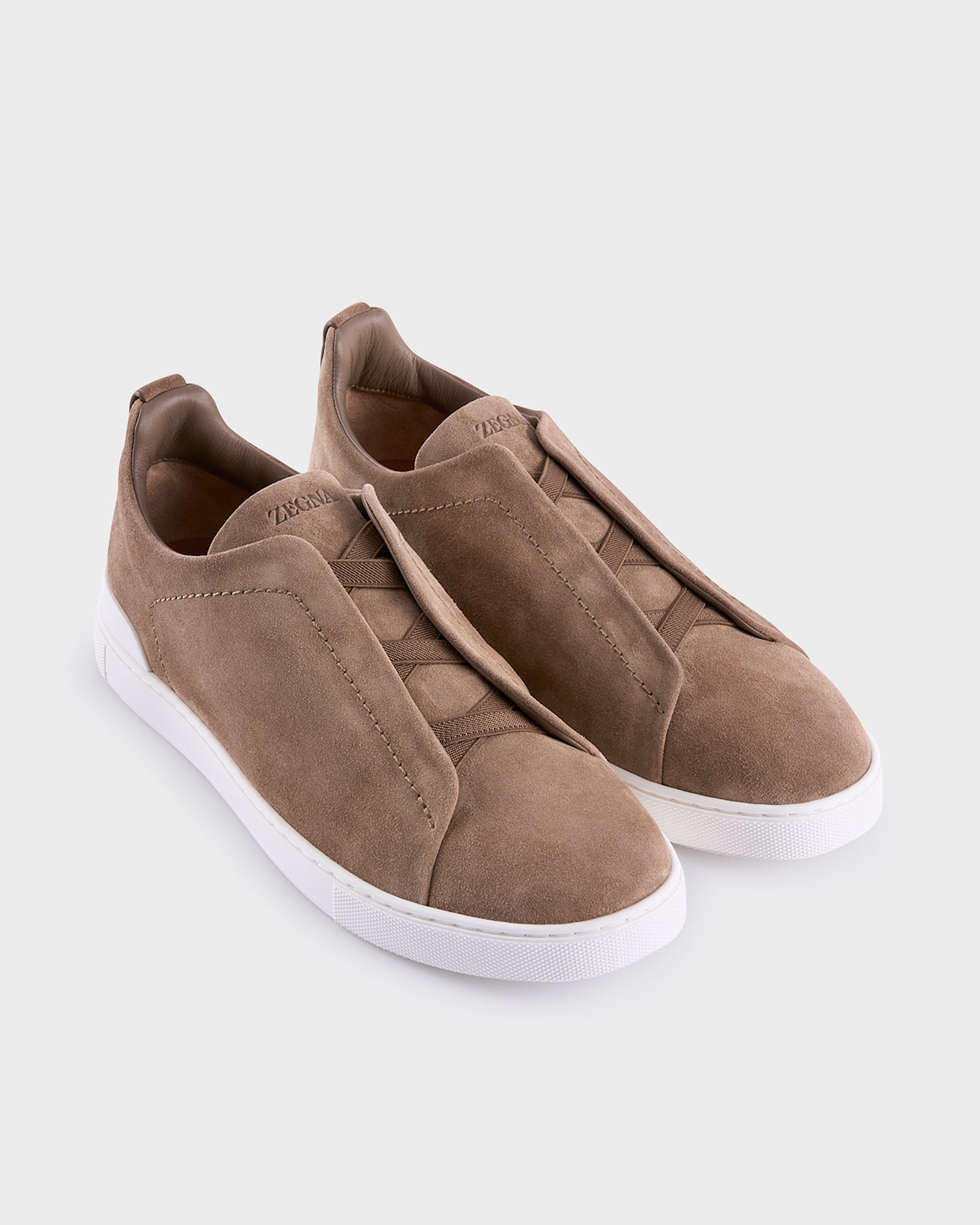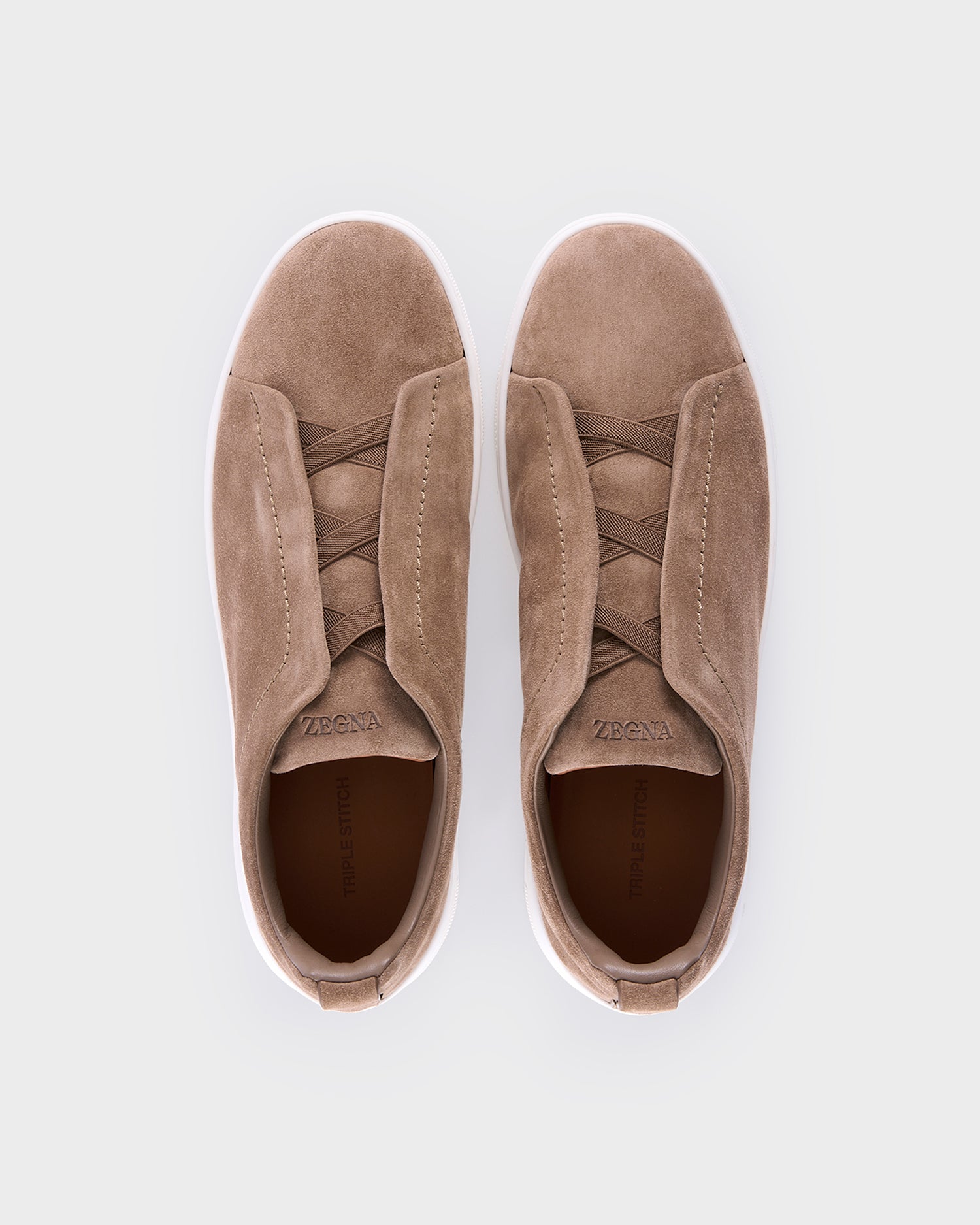 The beige suede Triple Stitch low-top sneakers' construction makes them lightweight and flexible. The brand’s signature triple-crossed elastic detail ensures an easy slip-on fit, while evoking the traditional hand-stitching of tailored jackets to symbolise and honour ZEGNA’s legacy of fine craftsmanship. Foliage-coloured leather lining completes the look.