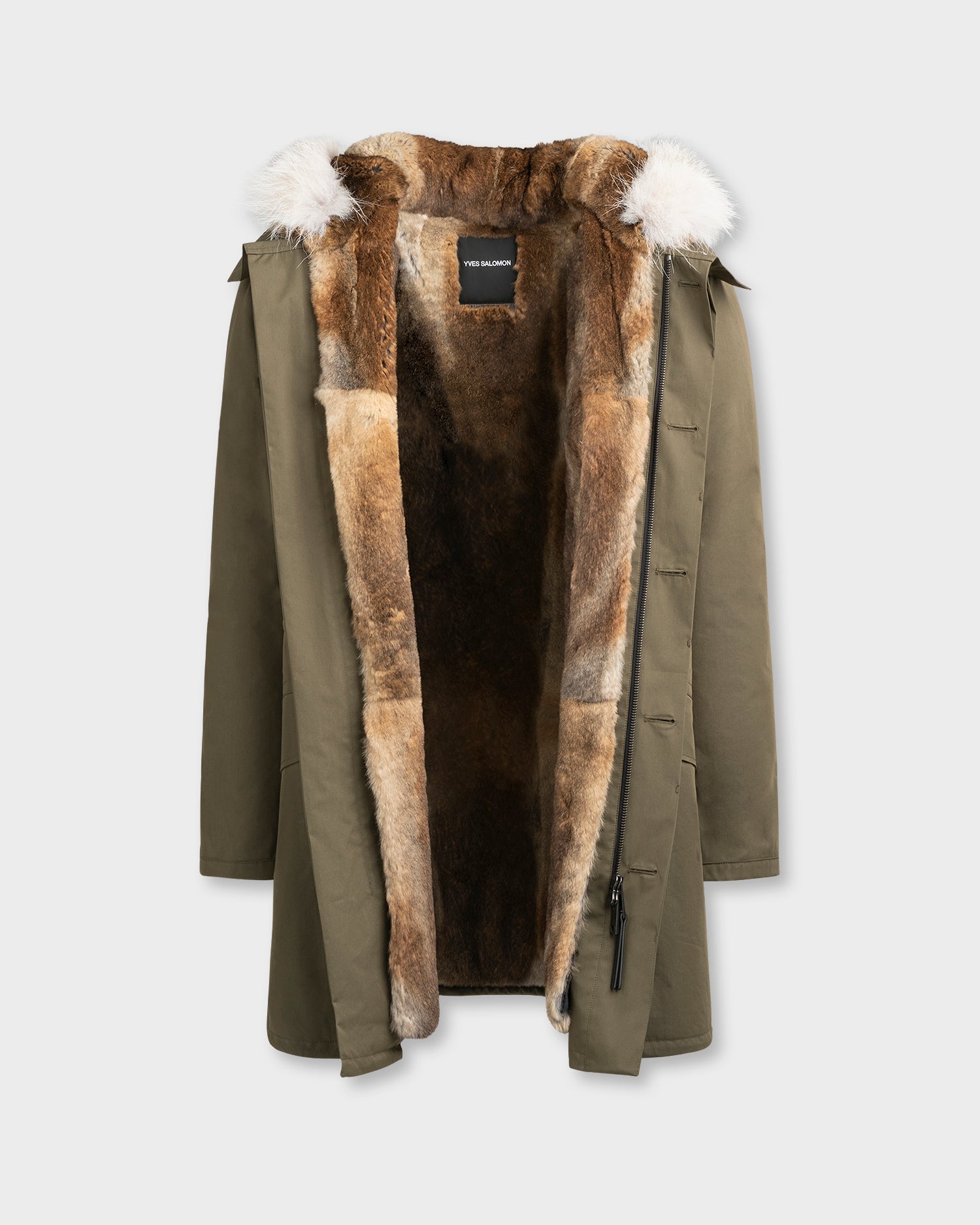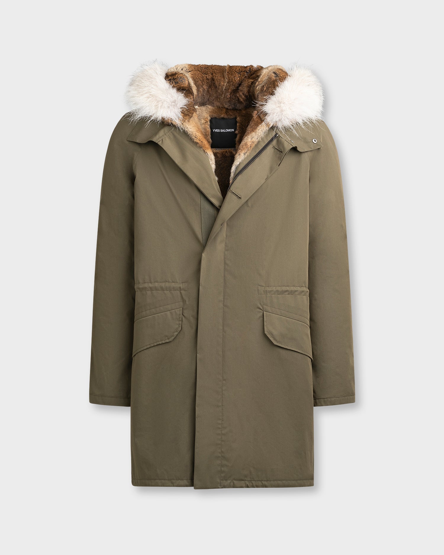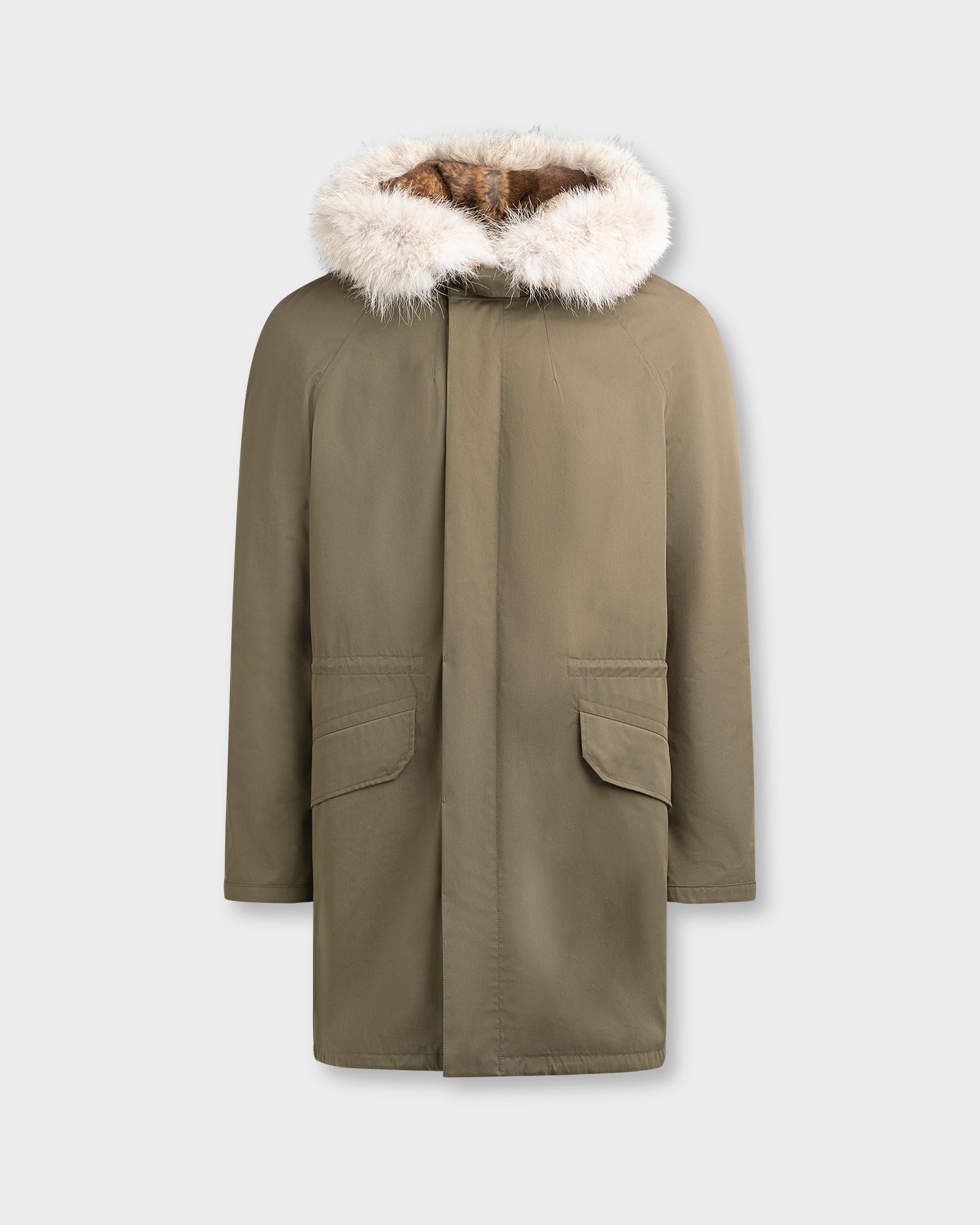 Winter's perfect parka. Its weatherproof technical fabric hides a removable rabbit-fur lining, while the fox trim of the hood is also detachable. A drawstring at the waist allows the fit to be adjusted according to requirements, and a zip plus button fastening provides double protection against cold air.