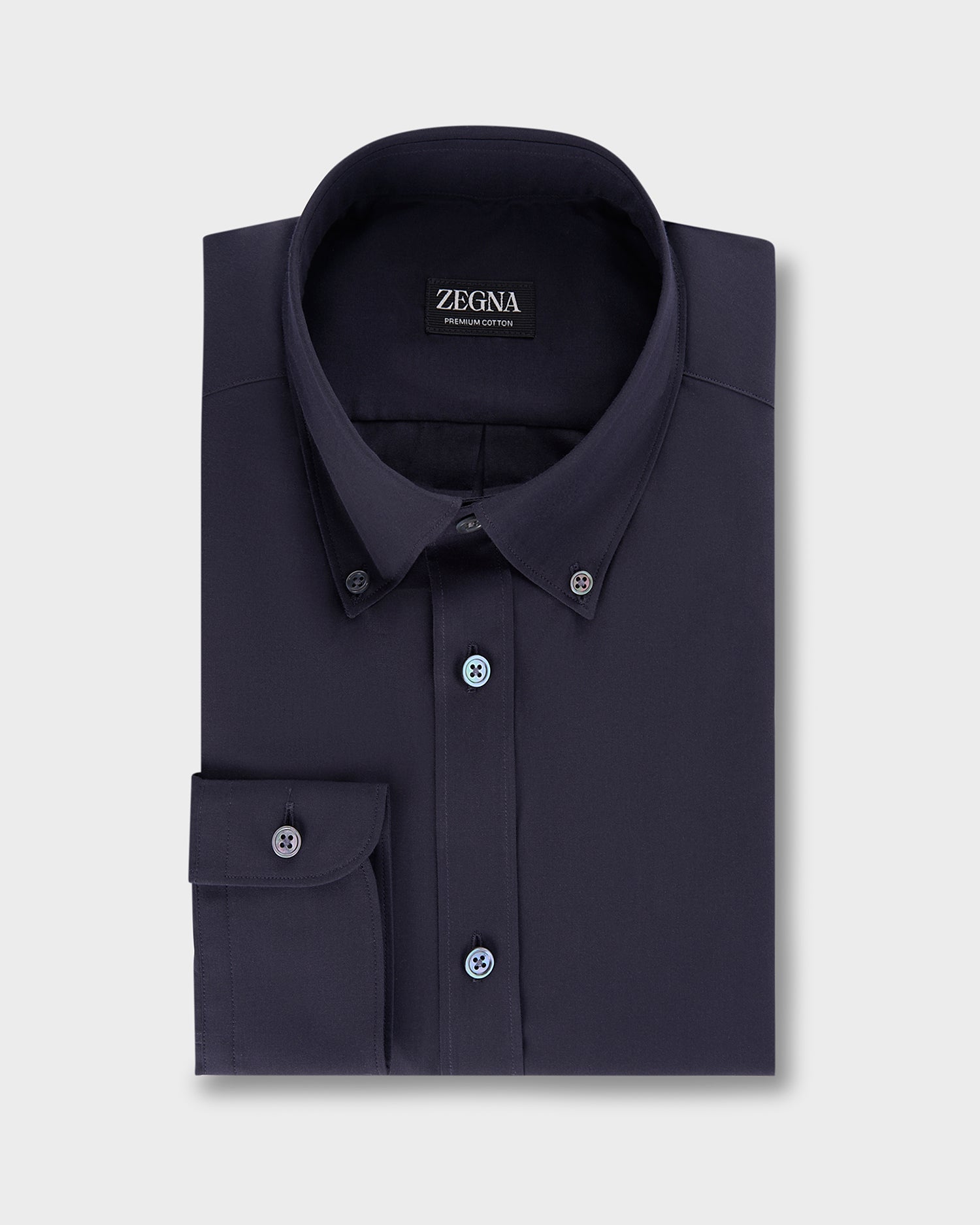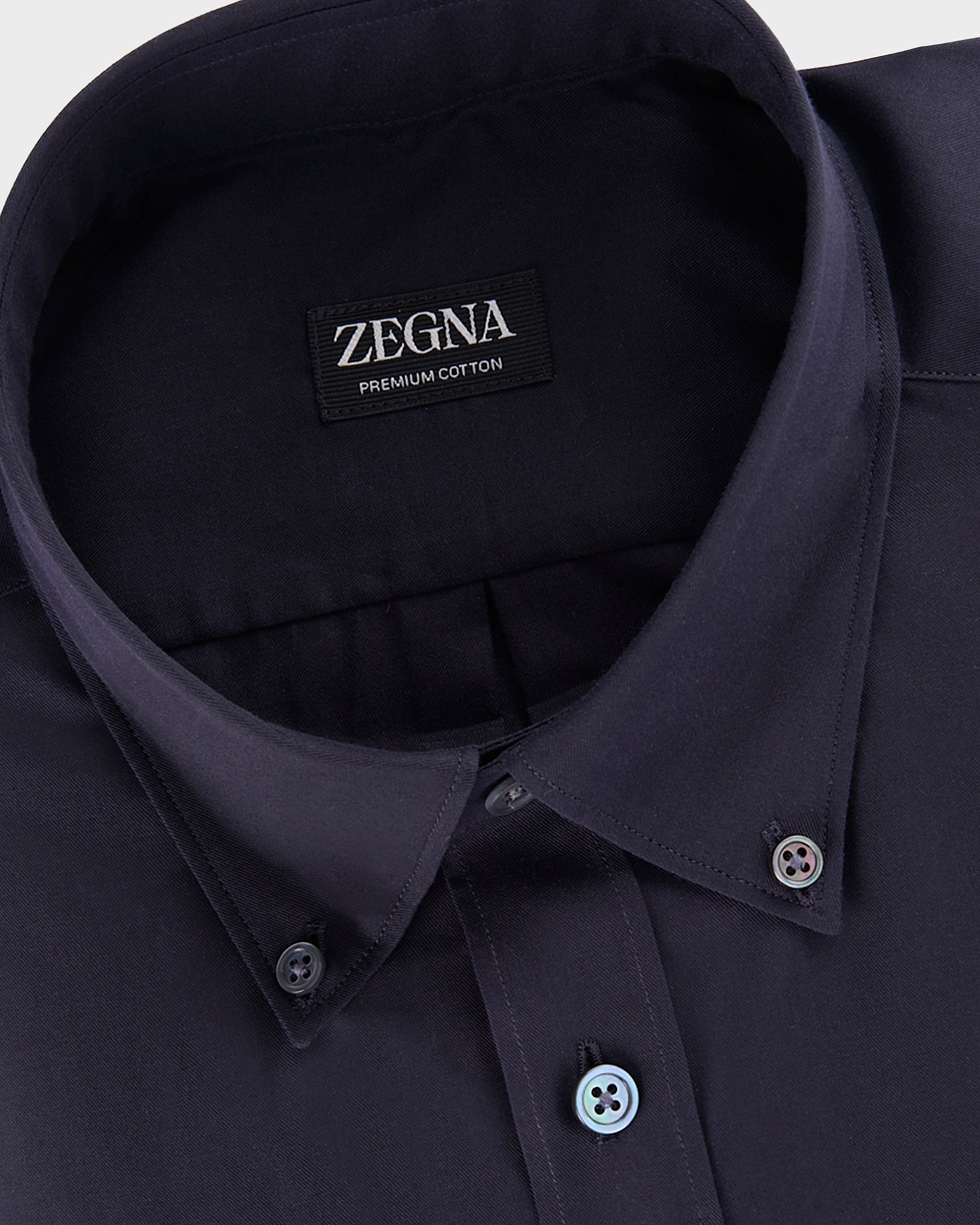 Thanks to its superior cotton fibers, the dark midnight blue Premium Cotton Zegna shirt is naturally smooth and wrinkle-resistant. Only long-staple fibres are used to create the Premium Cotton yarns of this garment, imbuing it with strength, softness and durability. The long-sleeve tailoring shirt is presented in a classic colourway. It is styled with a button down collar.