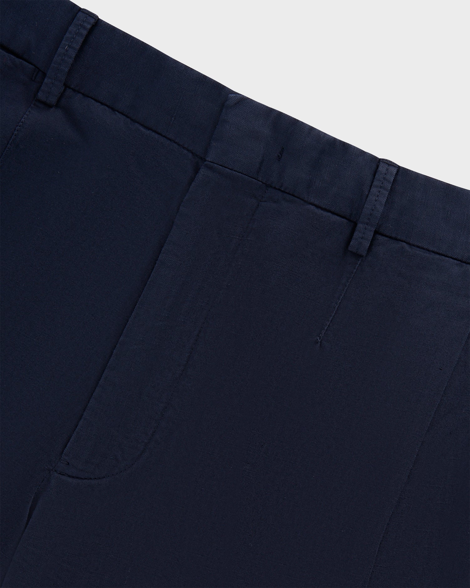 The navy blue Summer Chino cotton and linen shorts are styled with a crisp pleat.
