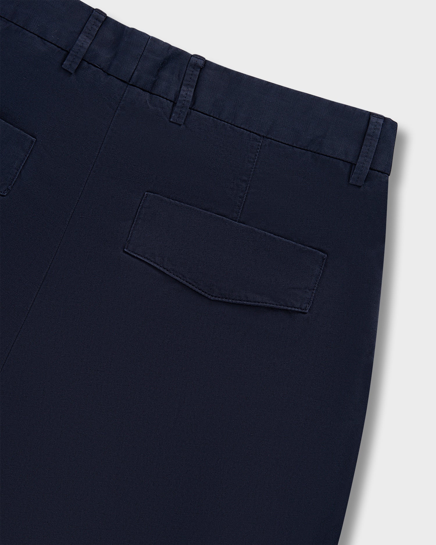 Enjoy the warm weather in style with the navy blue Summer Chino cotton and linen shorts. The fresh chino fabric keeps your look sharp and structured and enhances the classic pleated fit. The lightweight shorts are finished off with flap pockets on the back.