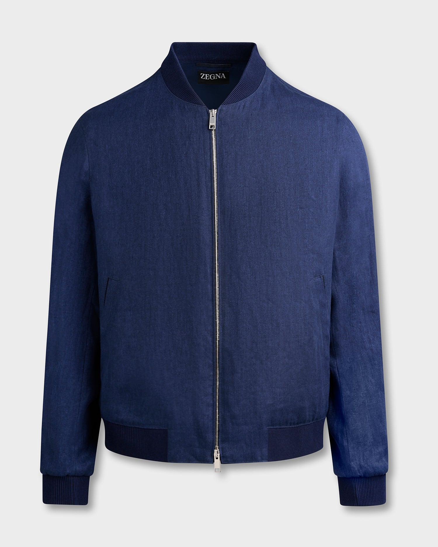 Crafted from our exclusive Oasi Lino, this navy blue pure linen bomber simultaneously embodies ZEGNA's vision of elevated leisurewear and sustainable luxury. Lined in silk-cotton, its timeless silhouette is edged with classic ribbed trims.