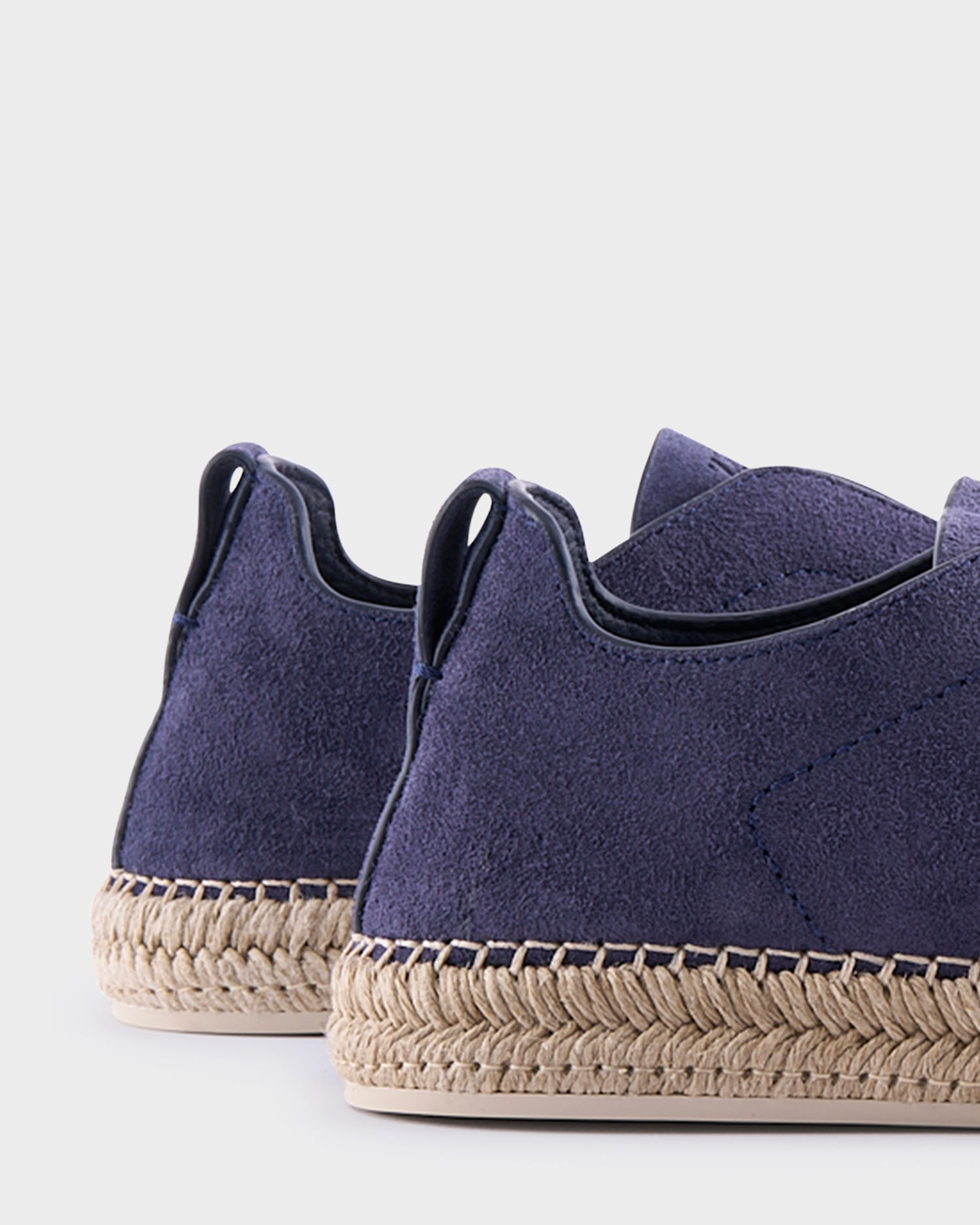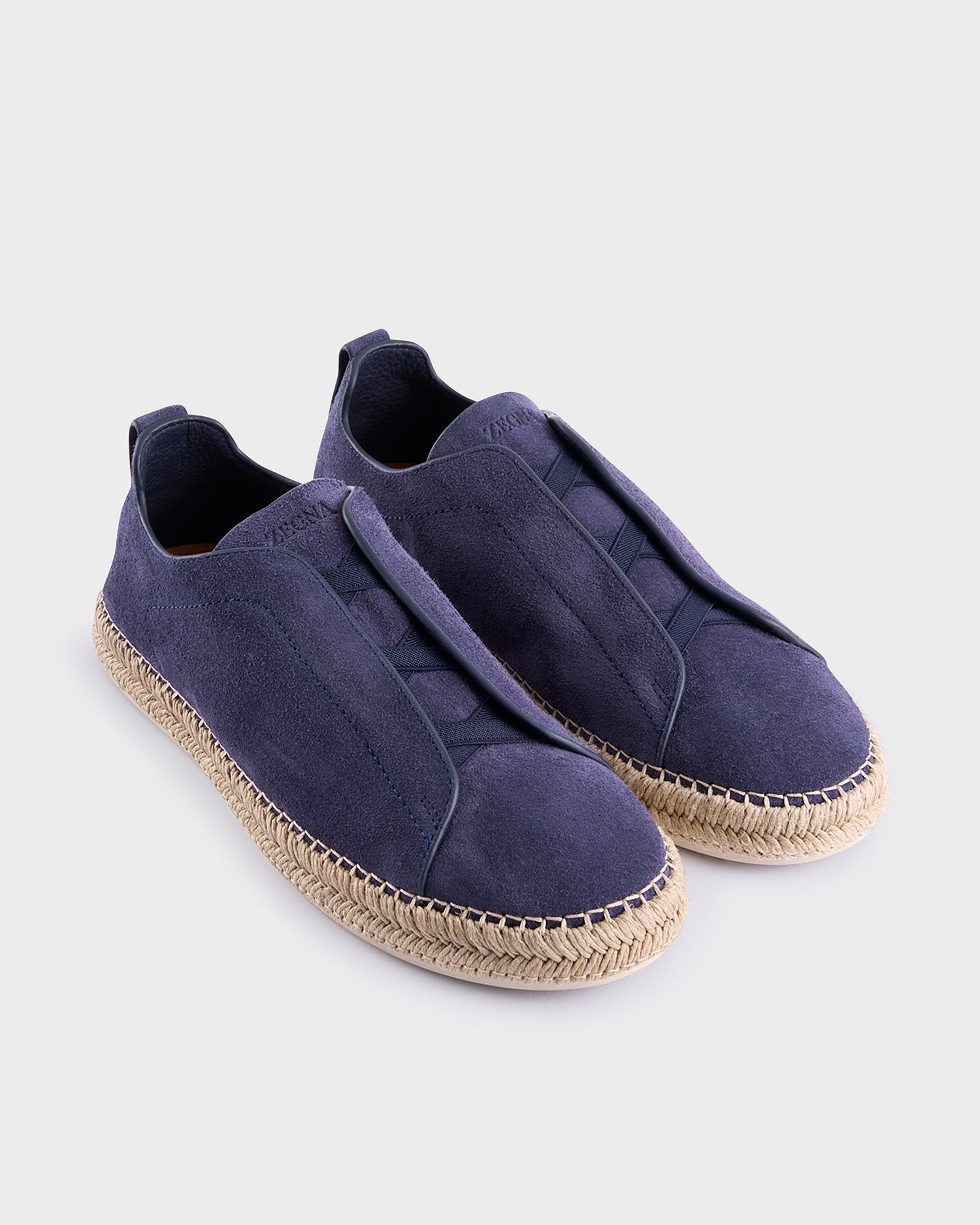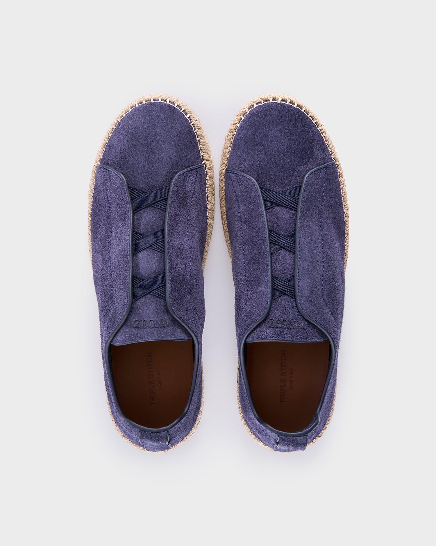 A lighter version of Zegna's iconic sneakers, the navy suede Triple Stitch espadrilles combine an unexpected mix of materials to create a chic look. Underneath the rich suede, the espadrilles' iconic roped midsoles are paired with lightweight rubber soles. Their signature triple-crossed elastics keep them secure while evoking the traditional hand-stitching of tailored jackets, a tribute to the brand's legacy.
