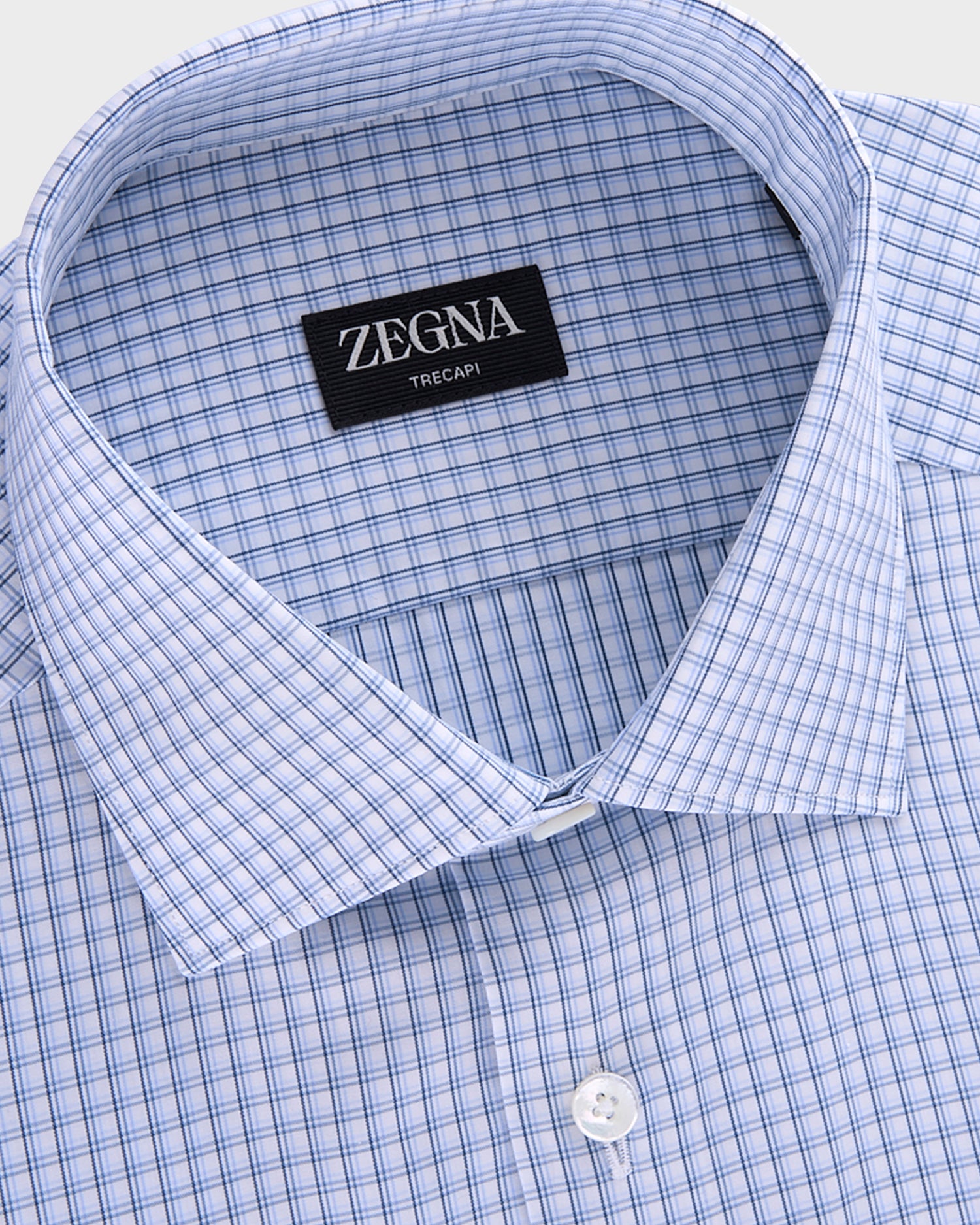 Made from superior Trecapi cotton, this shirt feels impeccably smooth whilst promising exceptional durability. Bringing timeless allure to any look with its white and light blue fine check pattern, it features a smart semi-spread collar and a rounded hem.